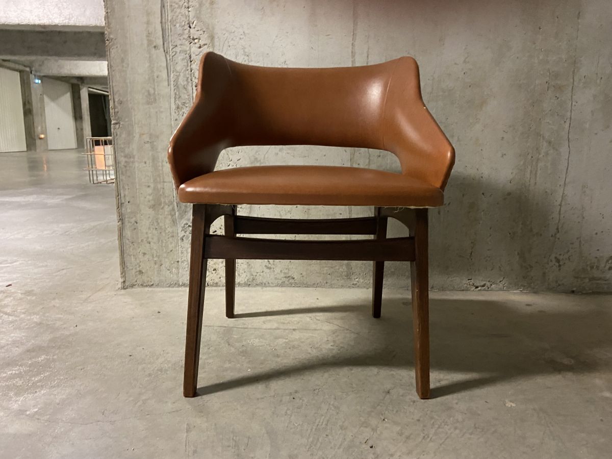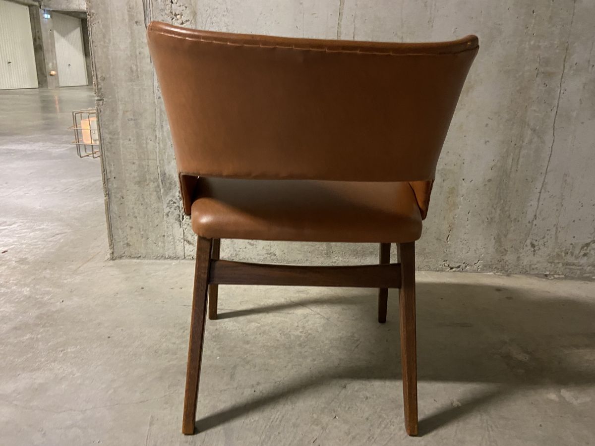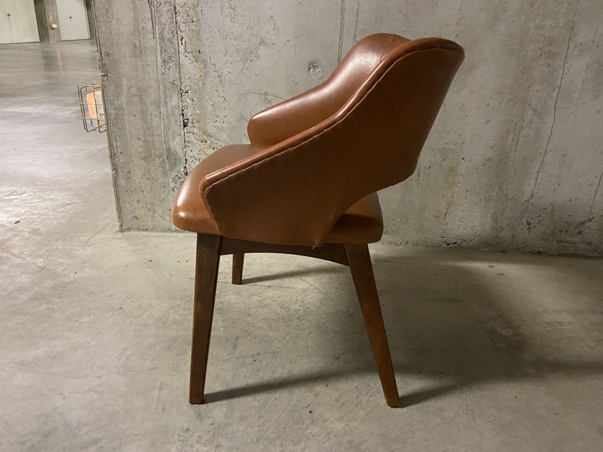 Fauteuil de bureau des années 50 en skaï couleur cognac, piétement en bois massif, quelques accrocs sur le dossier (voir photos) absolument sans conséquence, hauteur totale 71cm, hauteur assise 44cm, assise 50x45cm, largeur totale 56cm, profondeur 50cm.