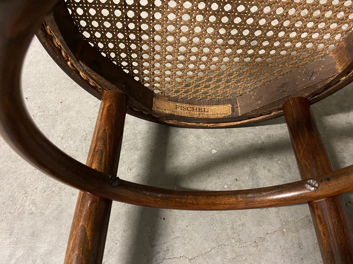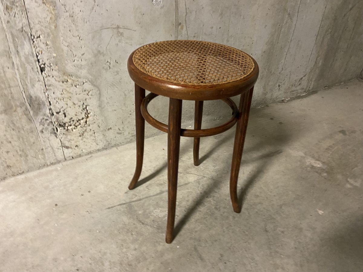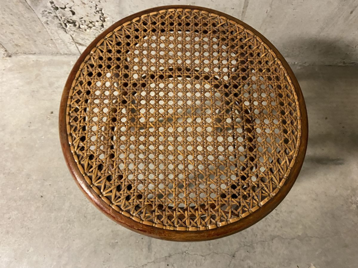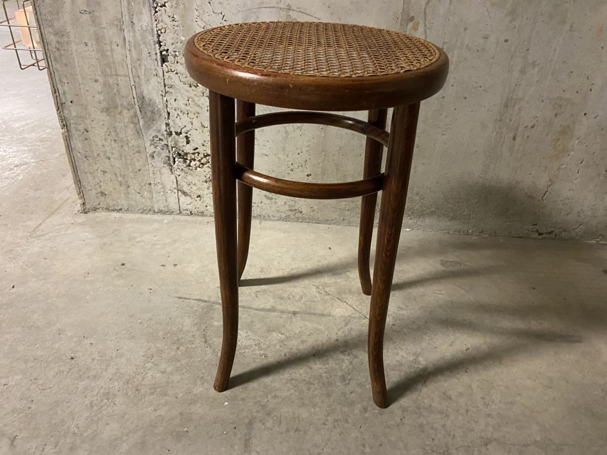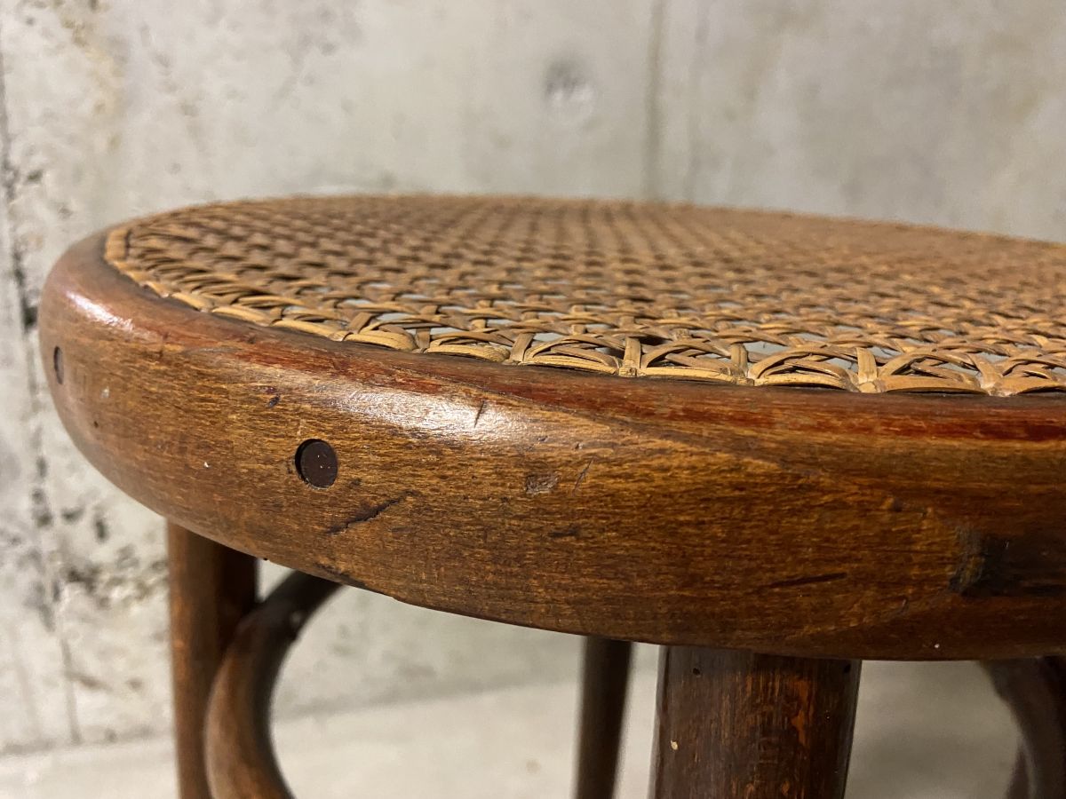 Tabouret canné de la marque autrichienne Fischel, bois de hêtre tourné, cannage impeccable, estampillé, hauteur 55cm, diamètre de l’assise 34cm, bon état.
