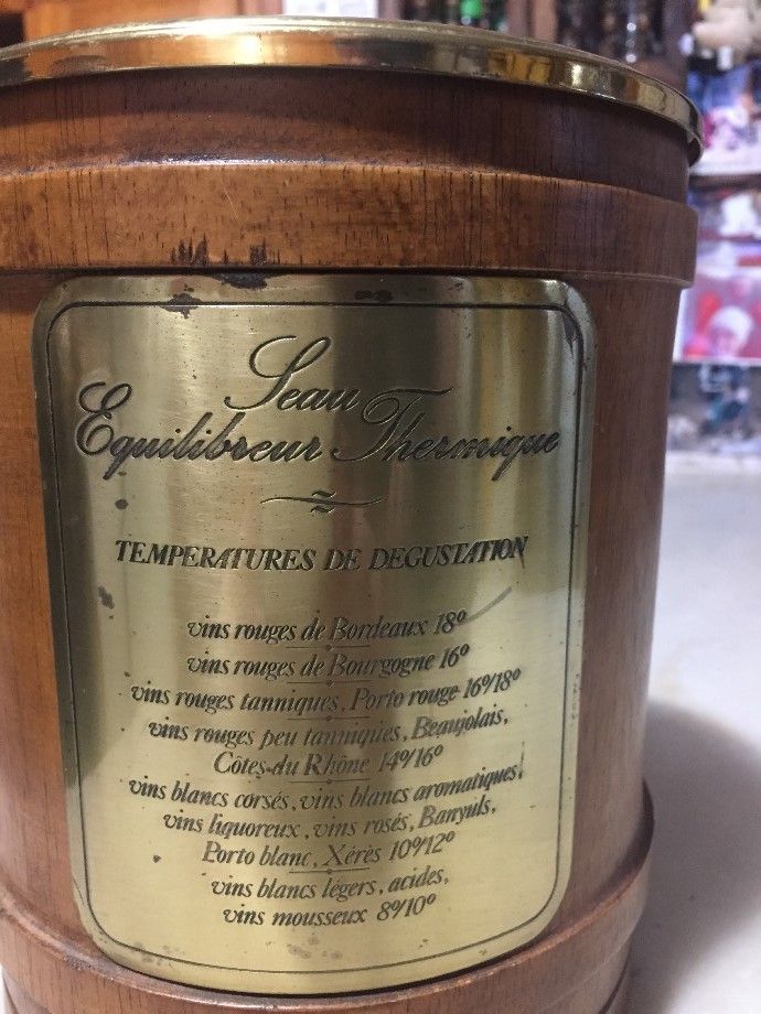 vends 1 seau équilibreur thermique de vins bois plaqué avec ses 4 glacettes - France – années 60 état correct - n’a que rarement servi, représentant des traces minimes d’age hauteur 20 cm Ø 16 cm poids 1 kg 800