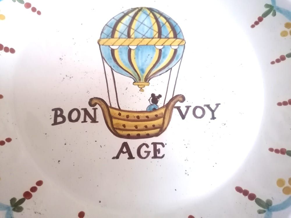 Assiette décoré en son centre d'un ballon montgolfière, un personnage dans la nacelle, entouré de l'inscription "Bon voyage".