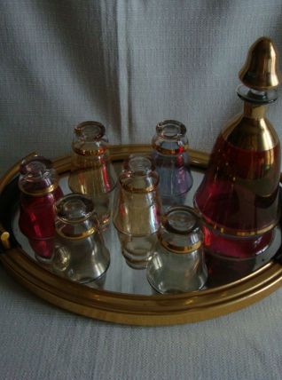 1 plateau ovale 36.5 x 25 au plus large avec miroir légèrement piqué tour et poignées en dorure "étiquette JLC Bordeaux" 4 petits supports rondelle en caoutchouc
