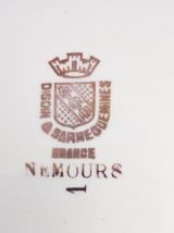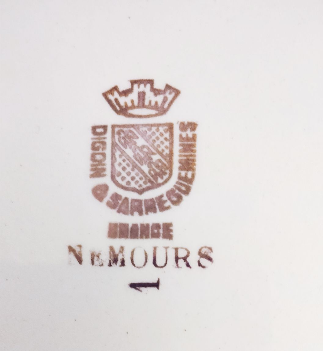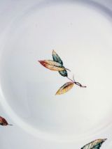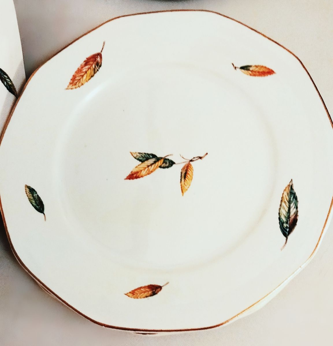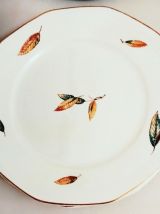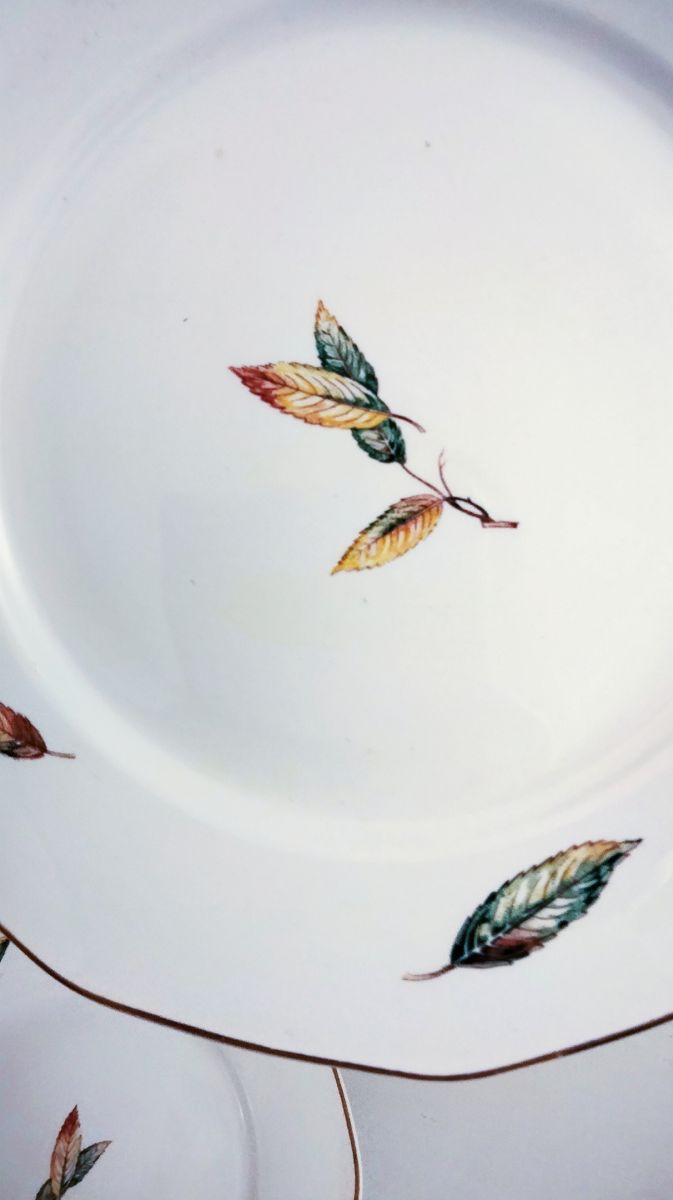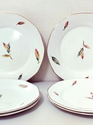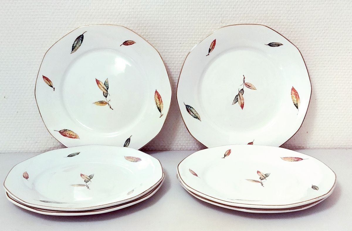 Lot de 6 Assiettes en porcelaine de Nemours, motif feuilles d'automne , liseré doré, aucune fêlure, toutes sont comme neuves.