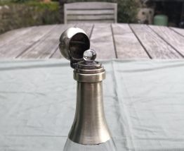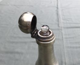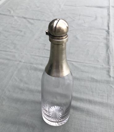 Flacon à eau de vie ancien, à col et bouchon en métal argenté.