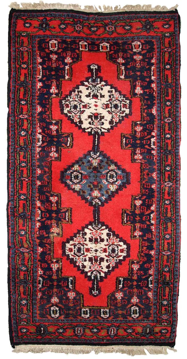 Handmade vintage Hamadan rug in bright red colour. The rug is in original good condition from the end of 20th century.