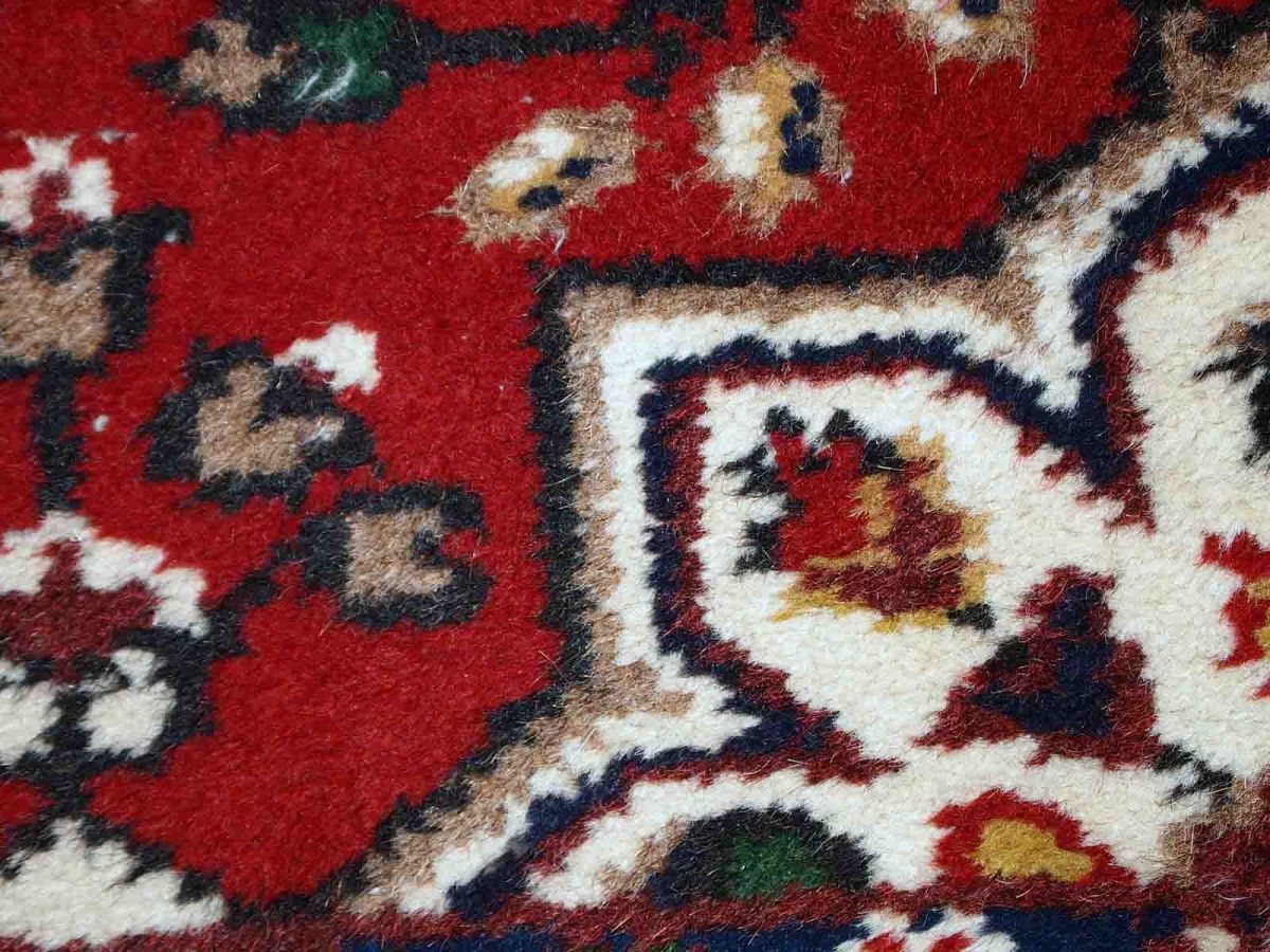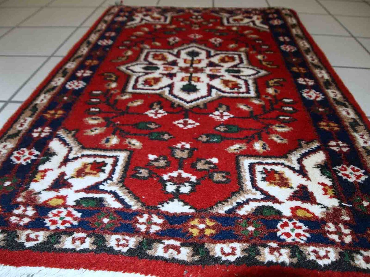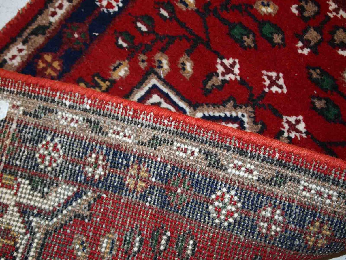 Handmade vintage Hamadan rug in bright red shade. The rug is in original good condition from the end of 20th century.