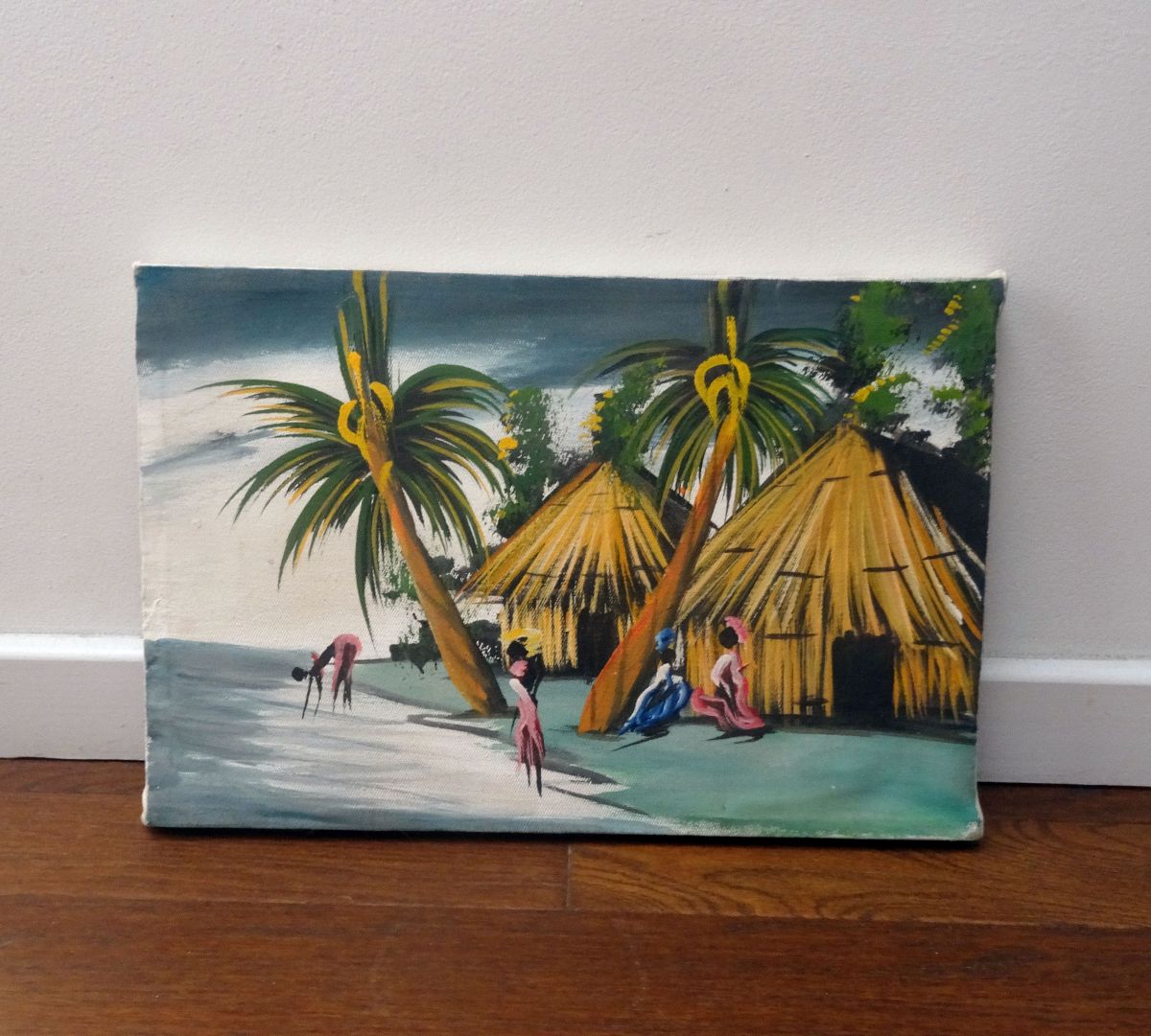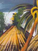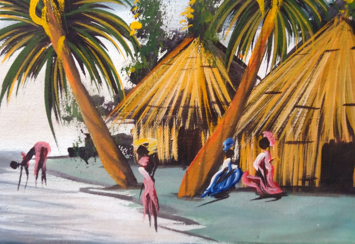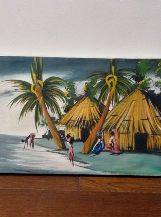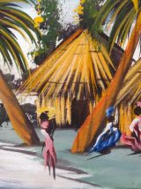 Jolie huile sur toile non signée de style Tiki représentant un village exotique (Africain? Caribéen?) aux maisons en paille au bord de l’eau. Au vu du style doit dater des années 50 ou 60. Le cadre et la toile laissent penser que le peintre a tout réalisé de A à Z. Une oeuvre naïve et émouvante pour une déco qui fait voyager!