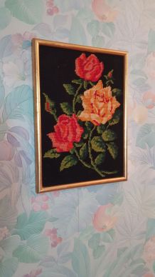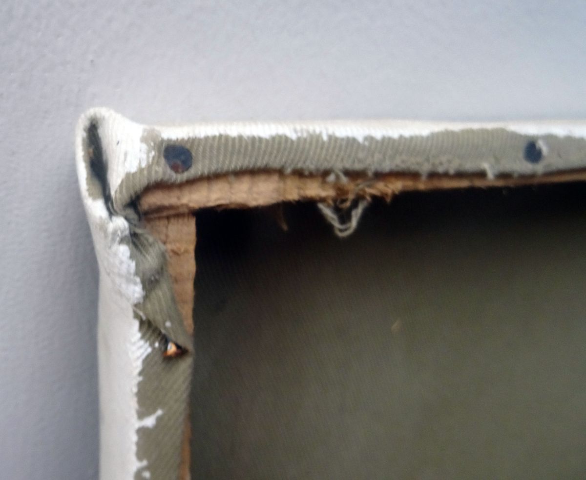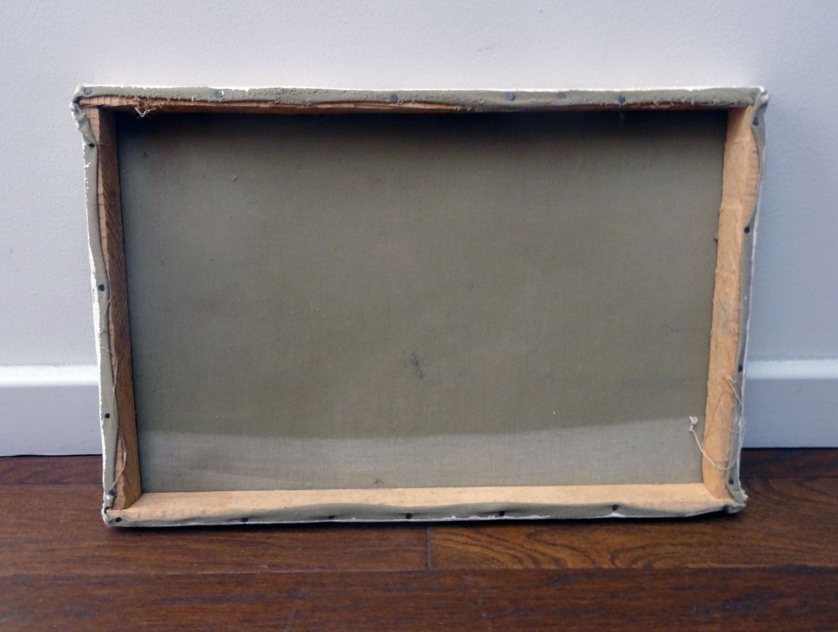 Dimensions & état: environ 42 cm longueur, environ 28 cm largeur, environ 3 cm épaisseur. Le cadre en bois et la toile tendue sont probablement faits main vu les imperfections de montage. A part ça, la peinture et la toile sont en bon état.