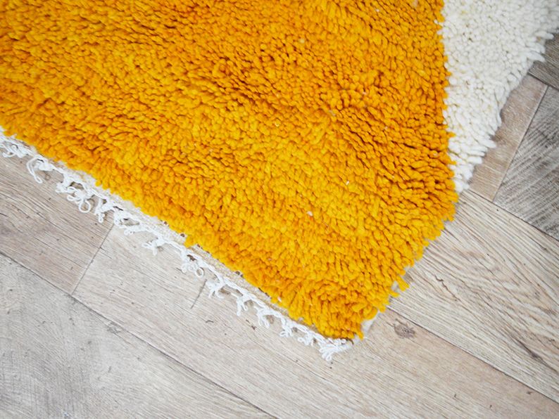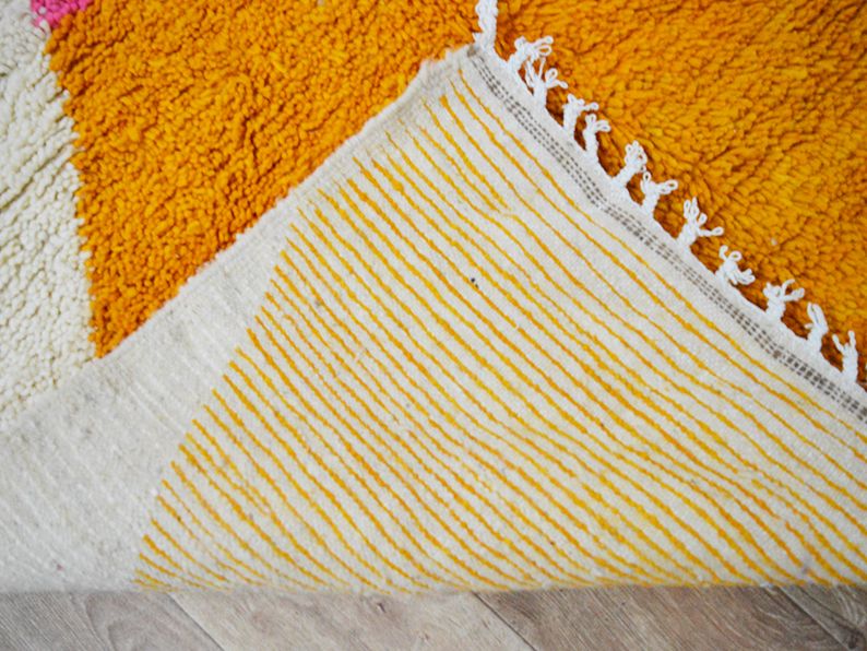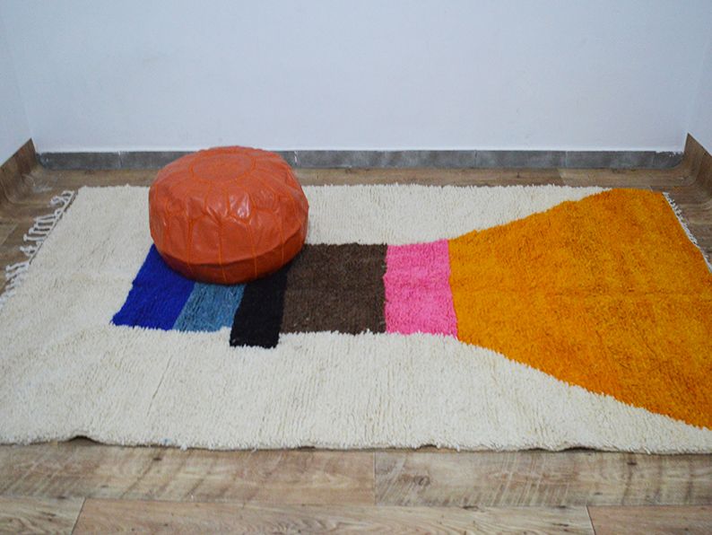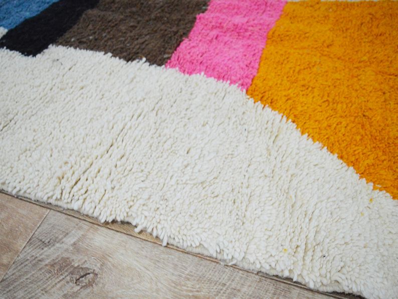 Noués à la main par la femme berbère des montagnes du Haut Atlas, les tapis sont fabriqués à partir de laine vierge brute avec une alternance de motifs composés d'un seul nœud et d'une ou deux lignes tissées. L'écriture trouvée sur le tapis raconte une histoire, bien qu'elle ne soit plus directement liée à la femme qui l'a créée, elles partagent toujours des écritures et des histoires traditionnelles sur la vie rurale, la féminité, la spiritualité, la maternité, le mariage et les carrières.