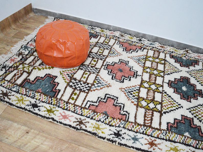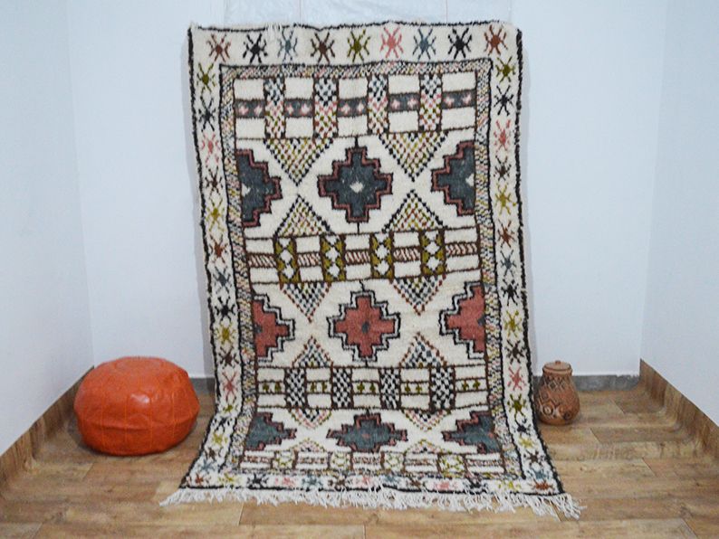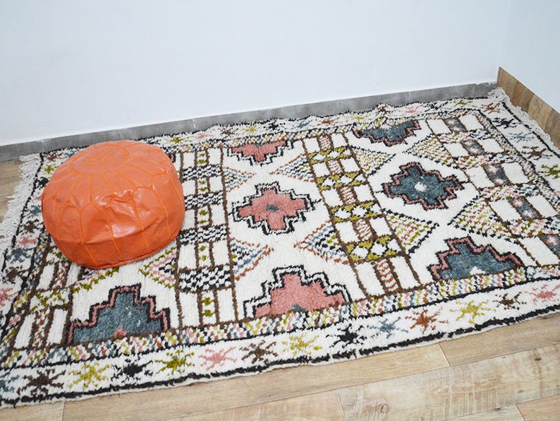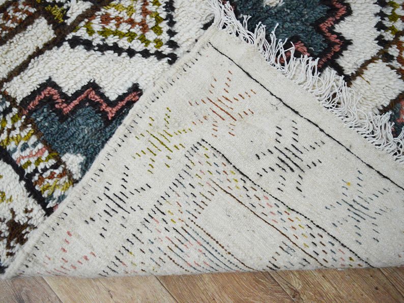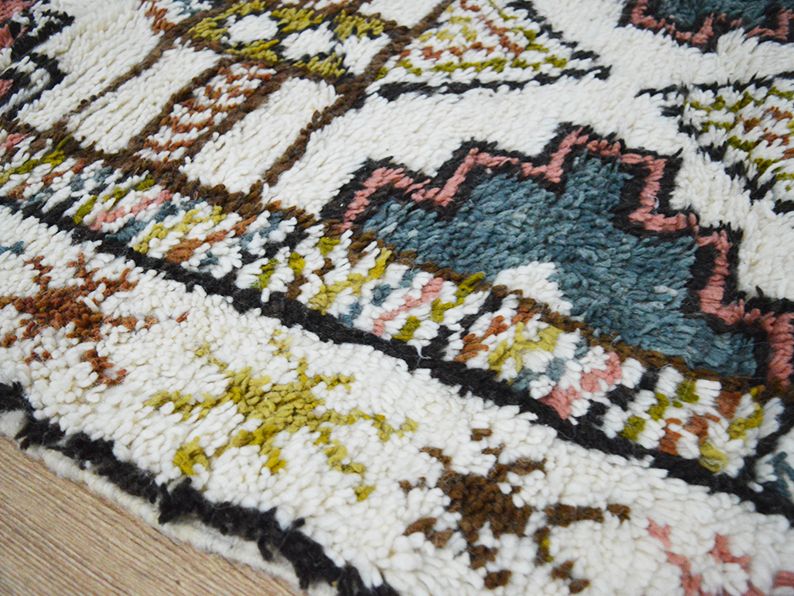 Noués à la main par la femme berbère des montagnes du Haut Atlas, les tapis sont fabriqués à partir de laine vierge brute avec une alternance de motifs composés d'un seul nœud et d'une ou deux lignes tissées. L'écriture trouvée sur le tapis raconte une histoire, bien qu'elle ne soit plus directement liée à la femme qui l'a créée, elles partagent toujours des écritures et des histoires traditionnelles sur la vie rurale, la féminité, la spiritualité, la maternité, le mariage et les carrières.