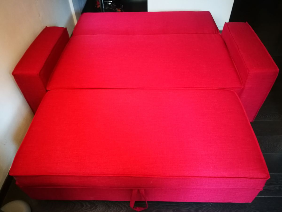 Canapé convertible en tissu rouge 3 places en parfait état. Mesures canapé: 175 cm L x 87 H x 95 P. Mesures lit: 175 x 195 cm. Disponible sur Gex à partir du 7 février.
