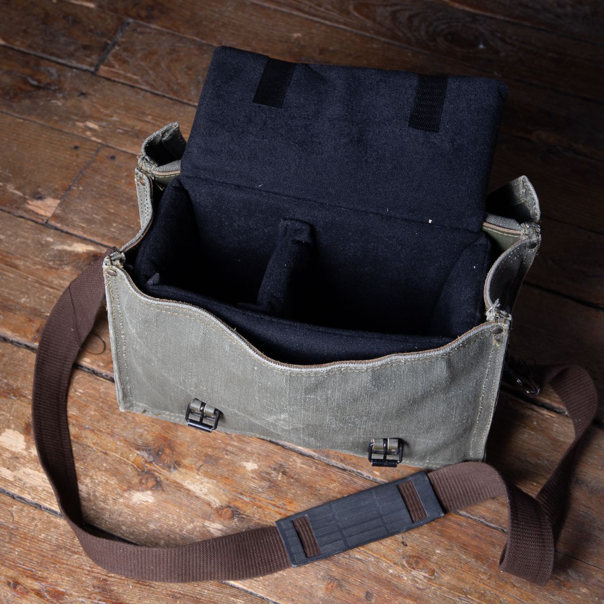 Très beau sac de l'armée Suisse customisée en sac photo. Il sera aussi un parfait sac à main, ou boîte à outils, en ôtant la mousse amovible.