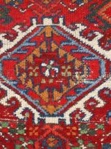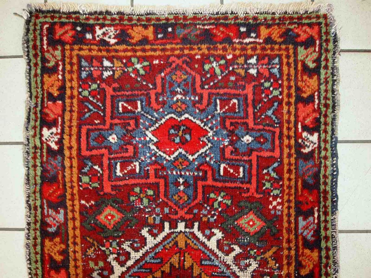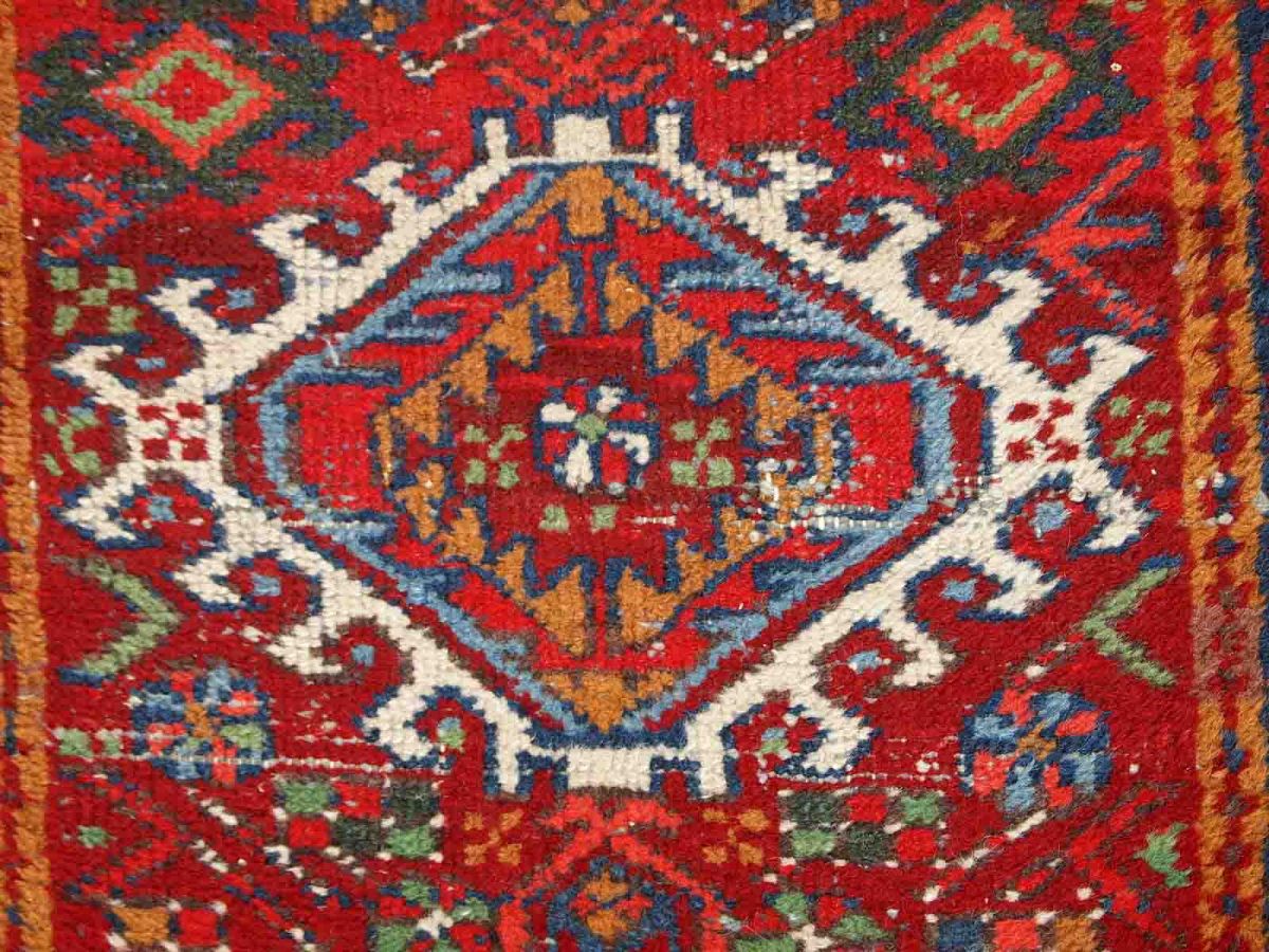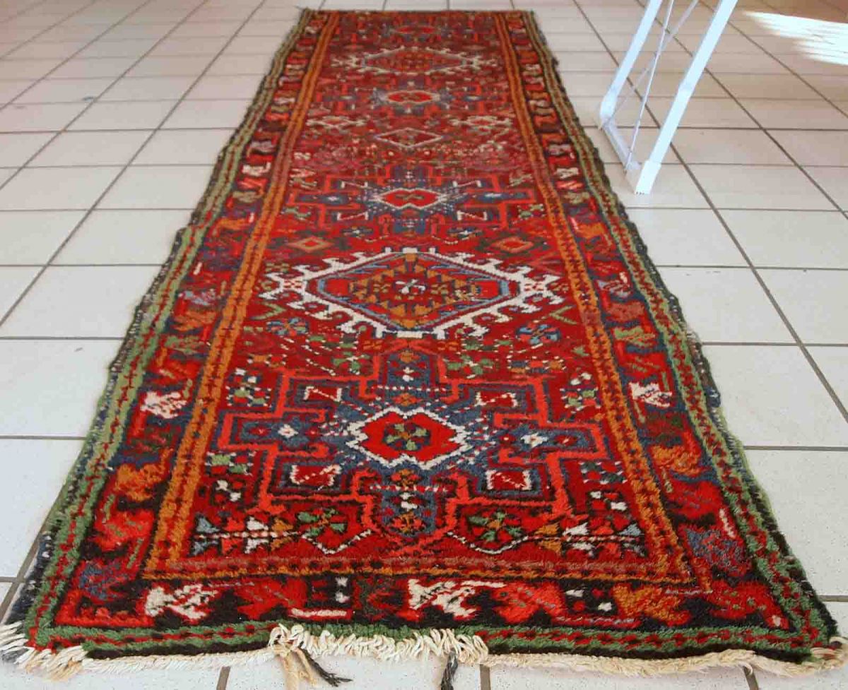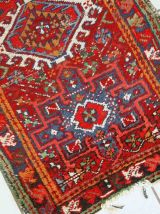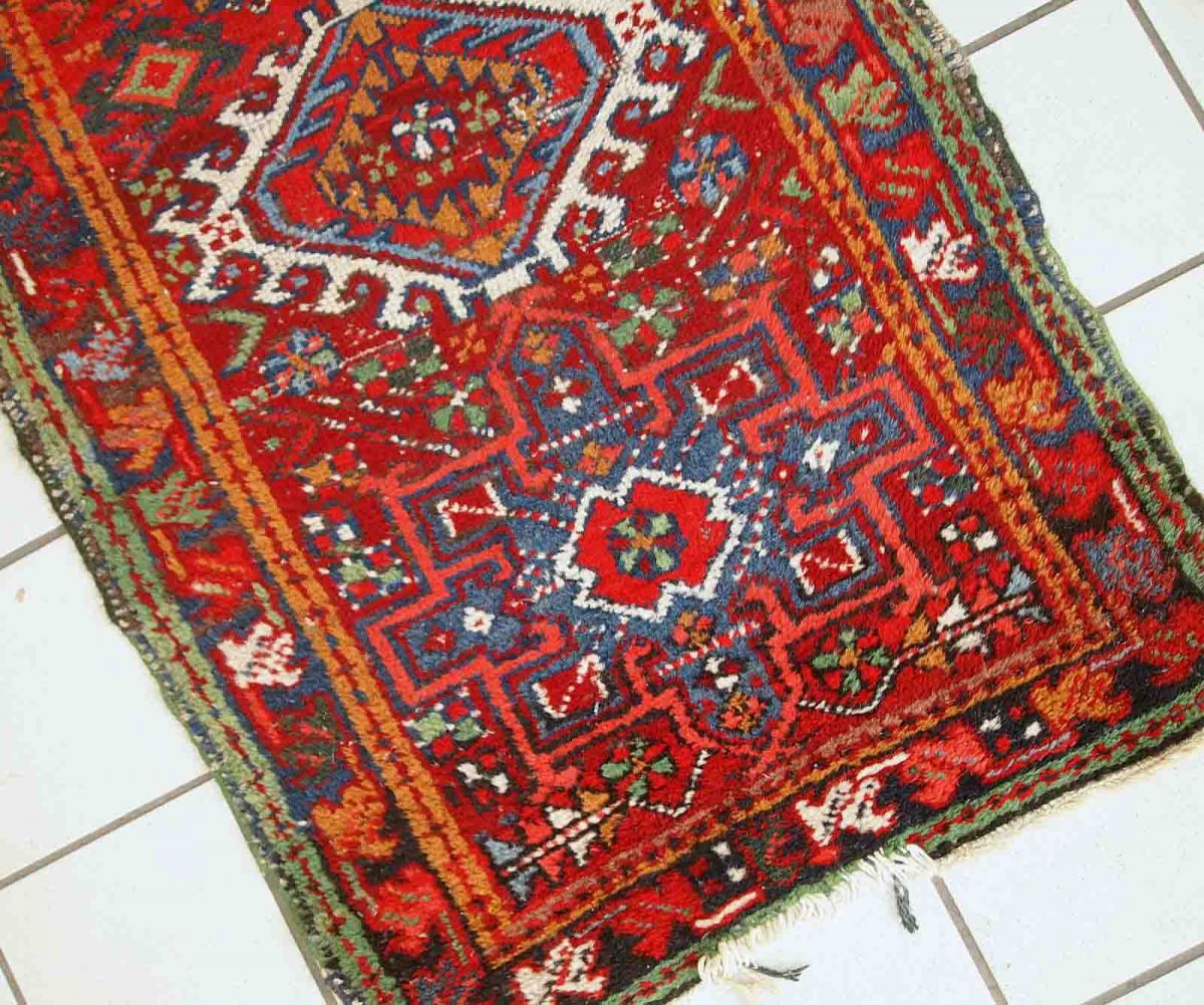 Handmade antique Karajeh runner in distressed condition. It has been made in the beginning of 2àth century in red wool.