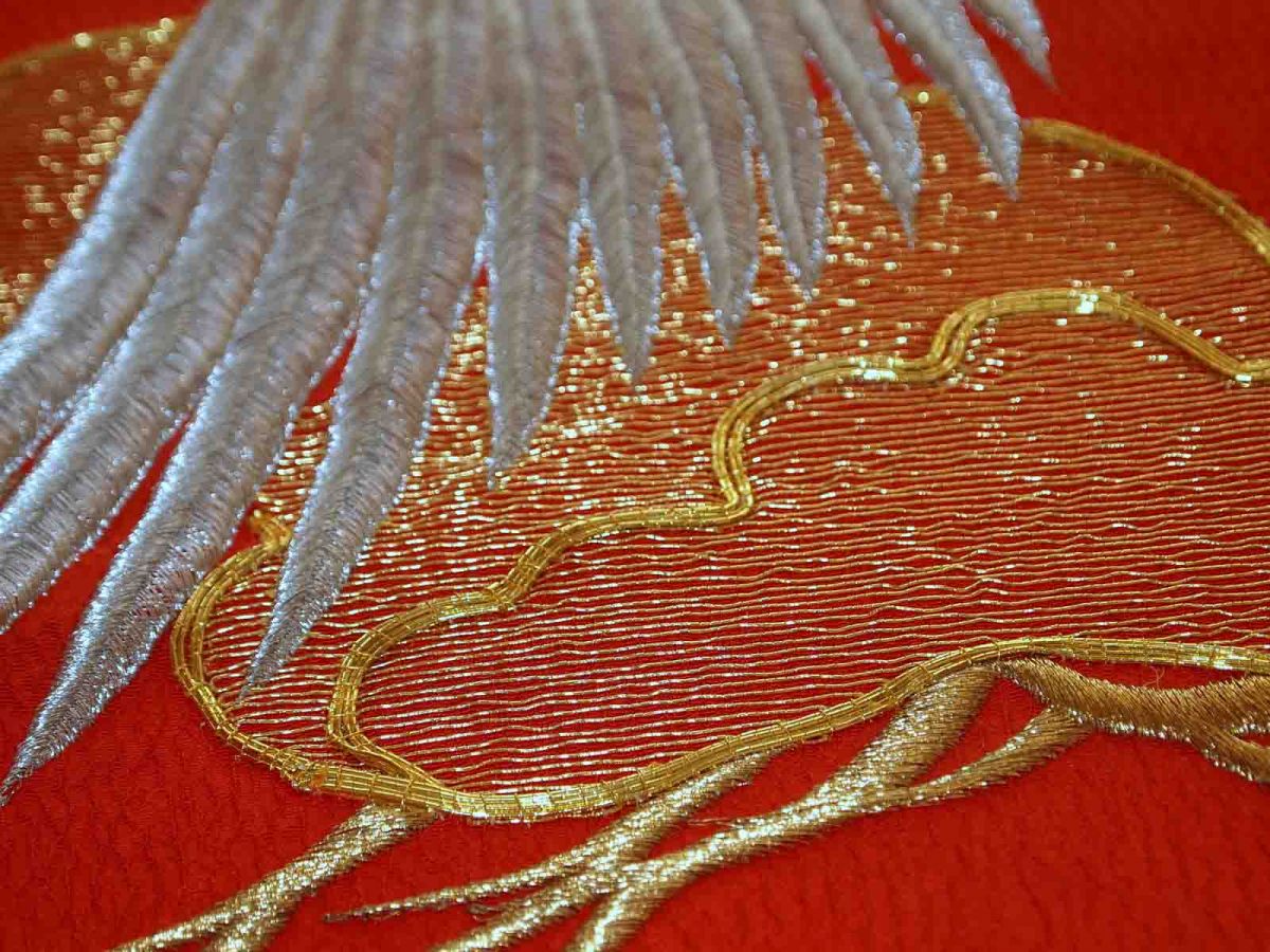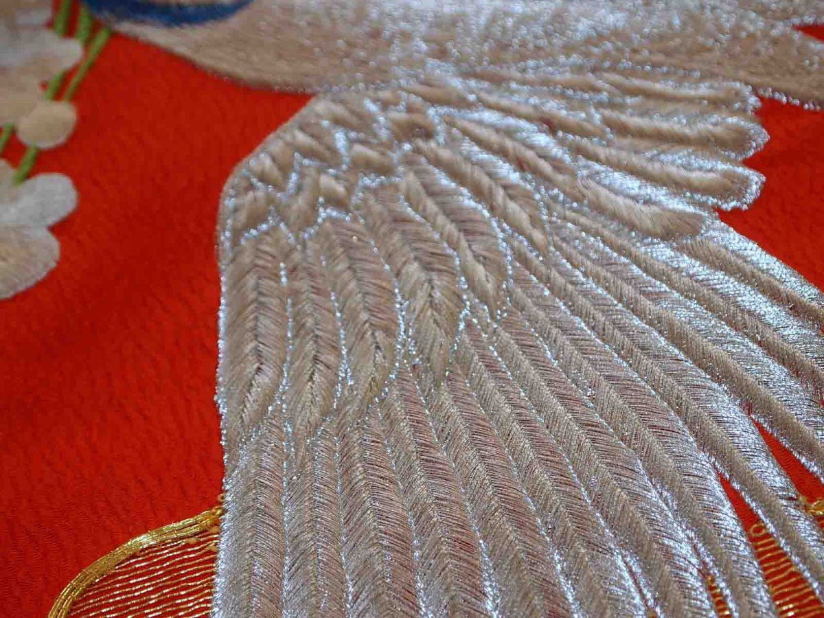 Handmade vintage embroidery from Japan made in cotton, silk and metal. This beautiful wall decoration has been made in the end of 20th century.