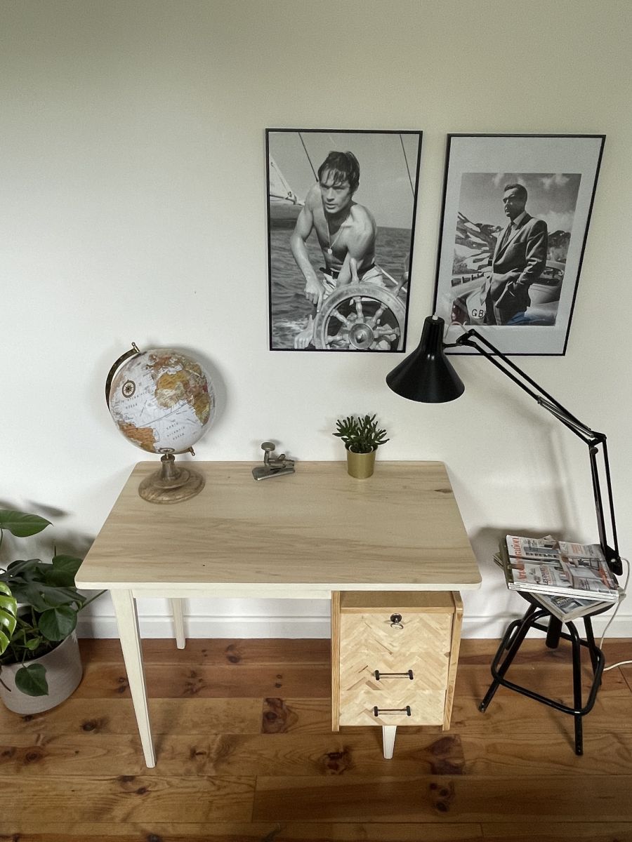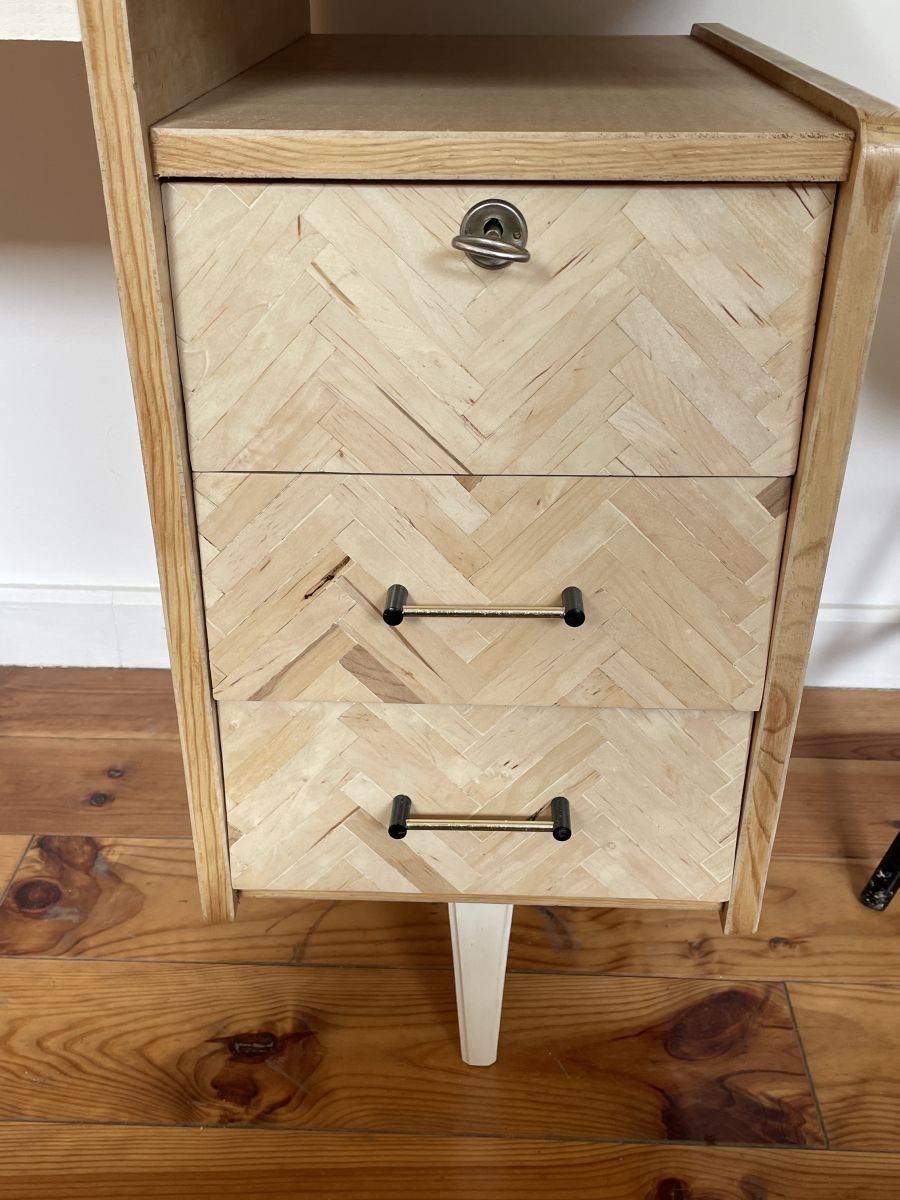 Joli bureau à longs pieds fuselés,composé de 3 tiroirs inclinés.Il a été poncé, les pieds ont été peint de couleur blanc cassé avec une peinture à la craie et ensuite ciré. Rajout d’une plaque de contreplaqué en bouleau sur le plateau,les façades de tiroirs on subit un petit relooking avec la pose de lamelles en bois naturelle. Utilisation d’un vernis mat pour la protection du plateau et des tiroirs .