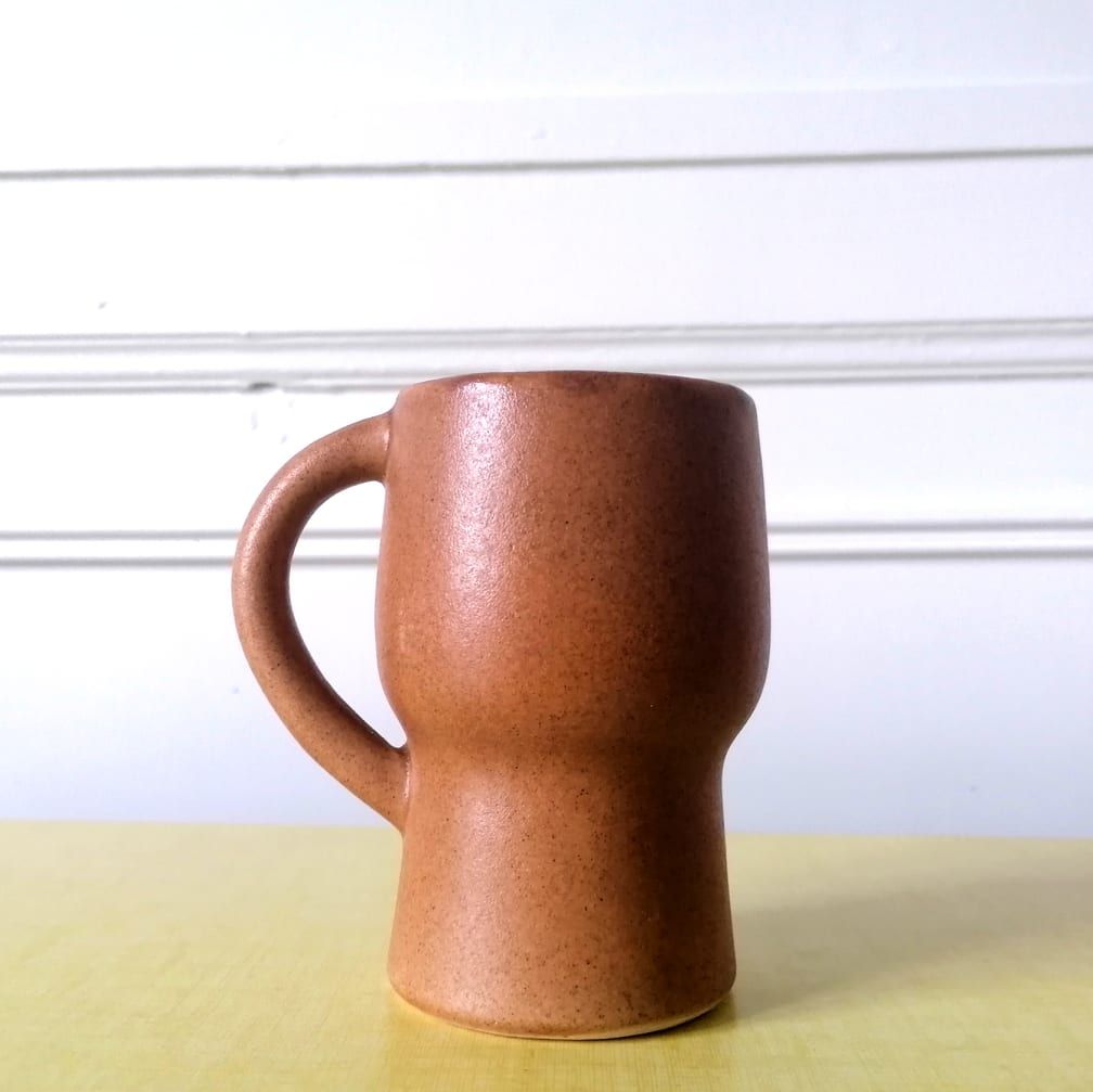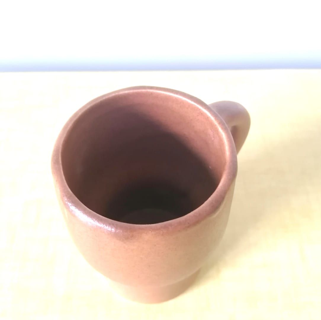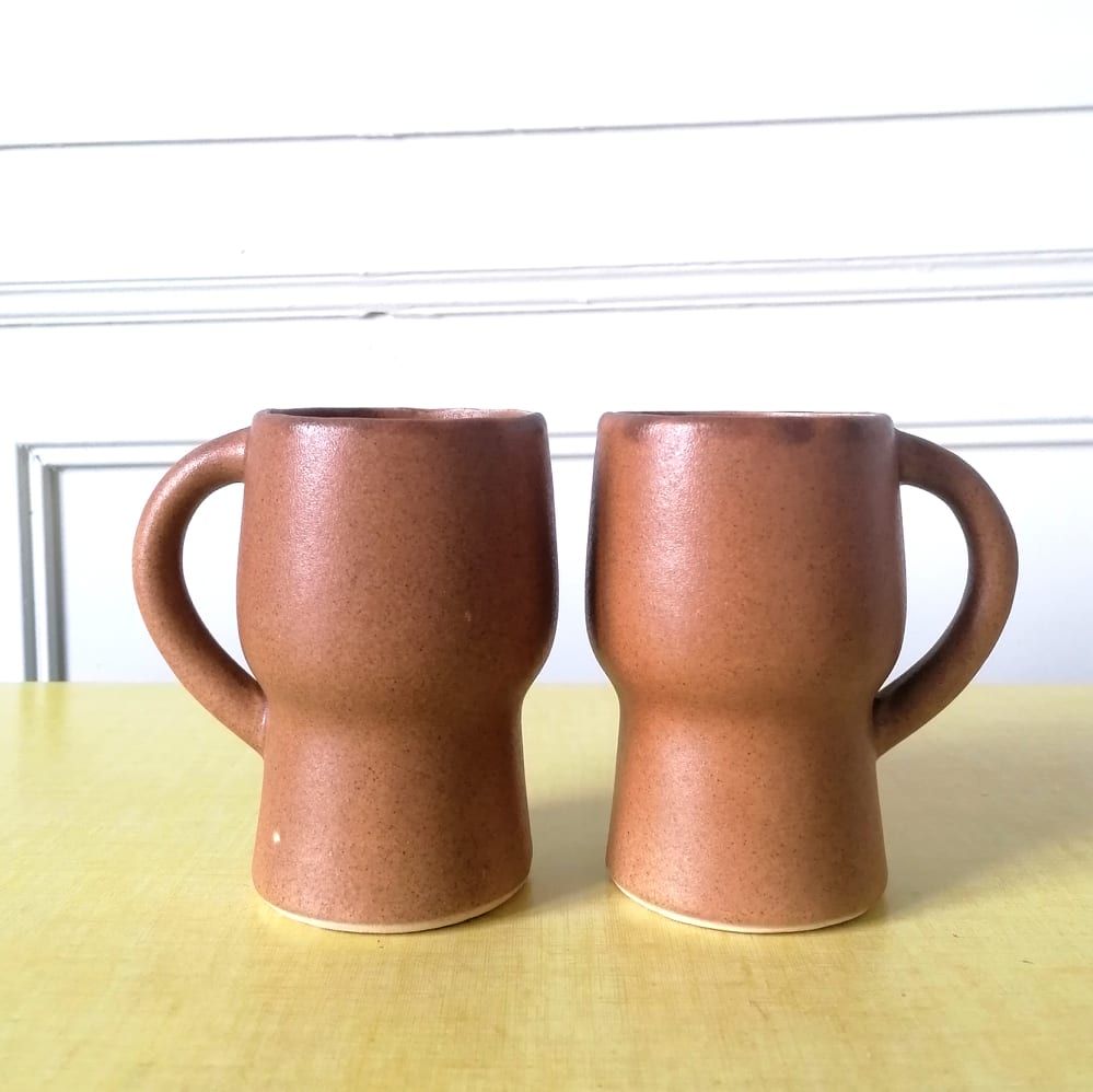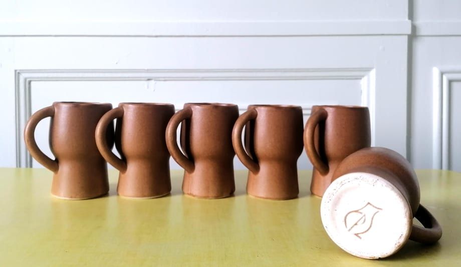 Ensemble de six tasses en céramique avec anse, de ton marron clair. La ligne de ces tasses est très élégante et reflète le goût pour les lignes design et les formes pures de l'époque. Signée au revers en creux du monogramme cp pour Claude Paci. En excellent état, pas un fêle ni un éclat.
