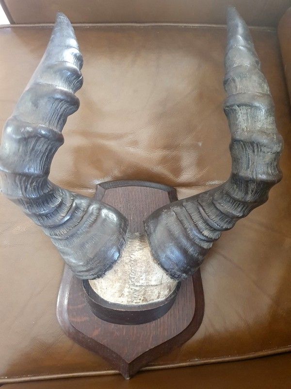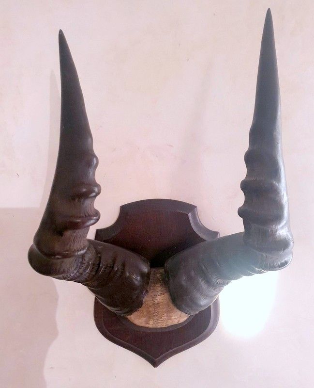Trophée de massacre d'antilope (sans doute un bubale), sur écusson en bois.