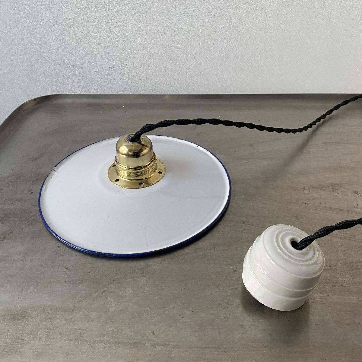 2 rares et petites suspensions en tôle émaillée blanche à liseret bleu. Années 1940. En très bel état malgré quelques traces du temps, dues a leur passé industriel.