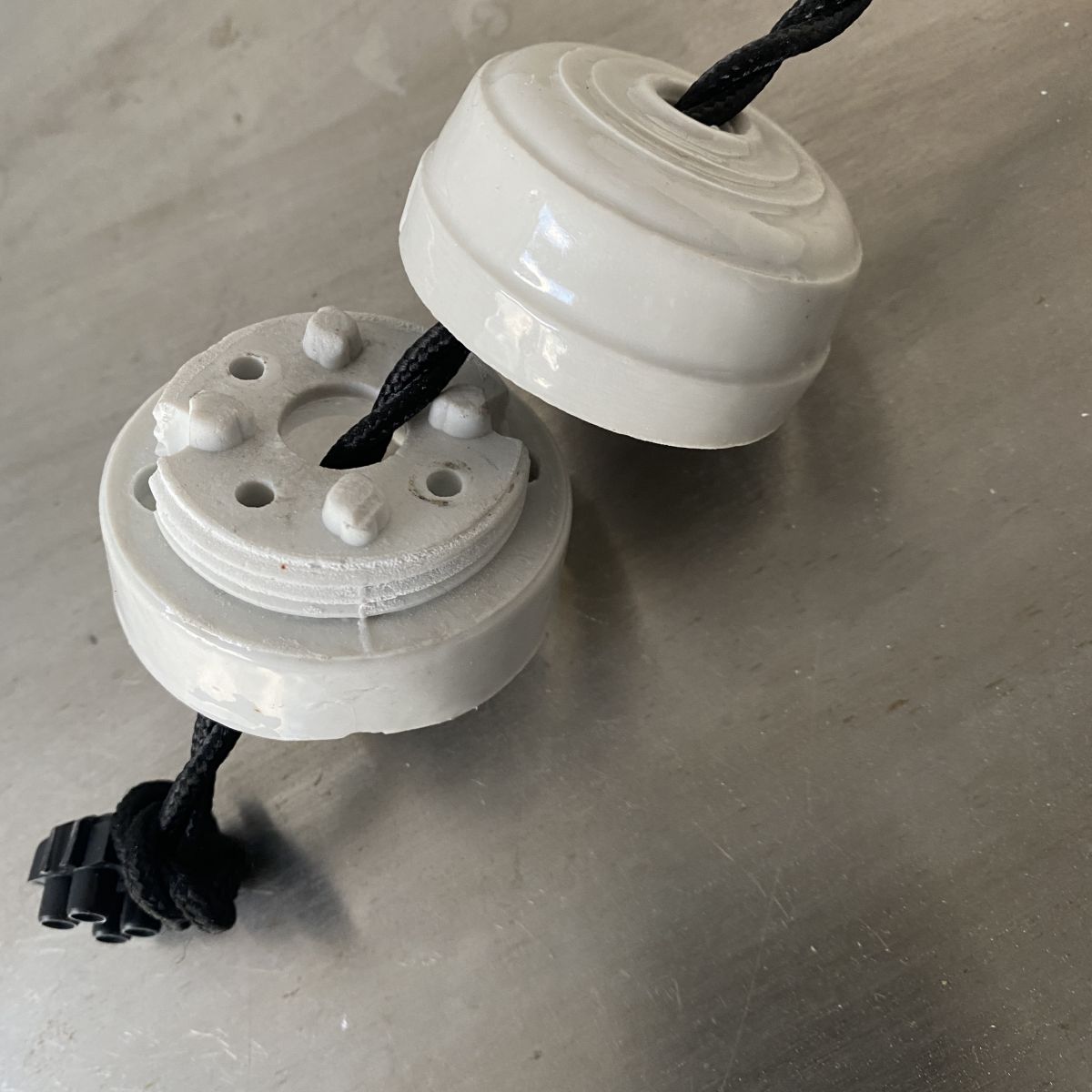 L’électricité a été refaite (ampoule E27). Branchement par domino. Fil noir en tissu noir tressé et rosace en porcelaine.