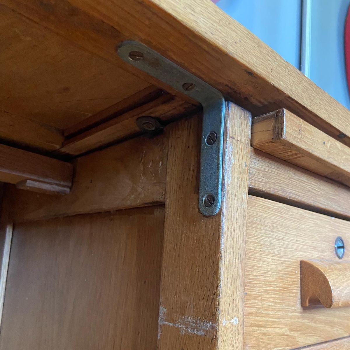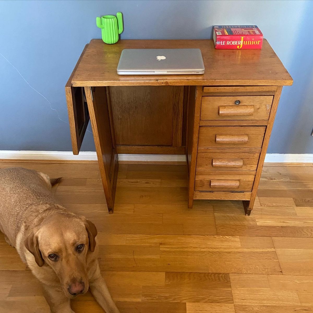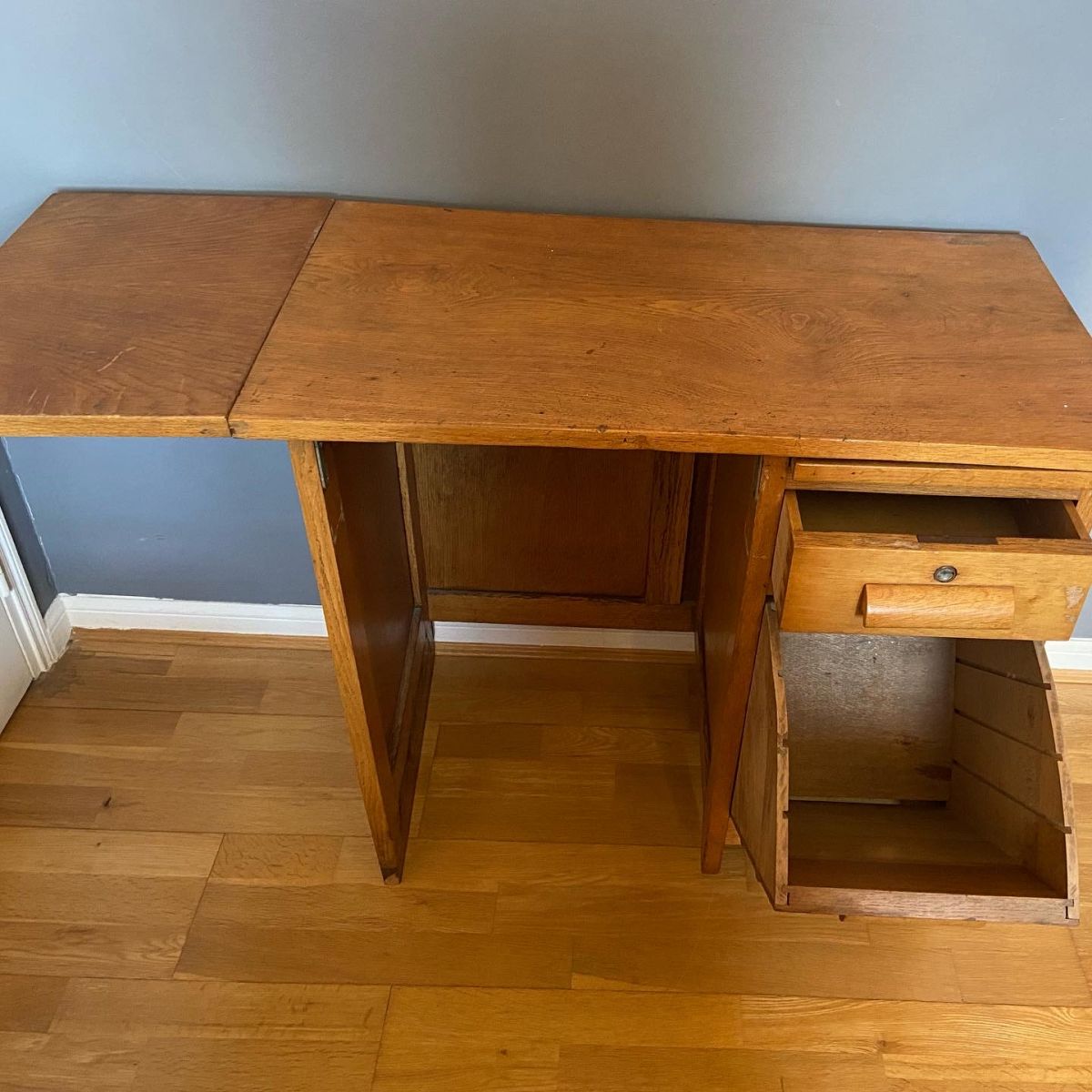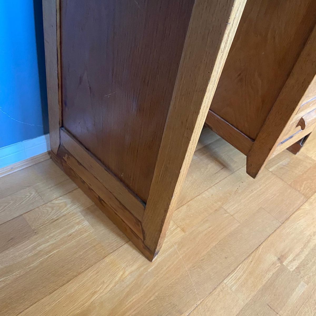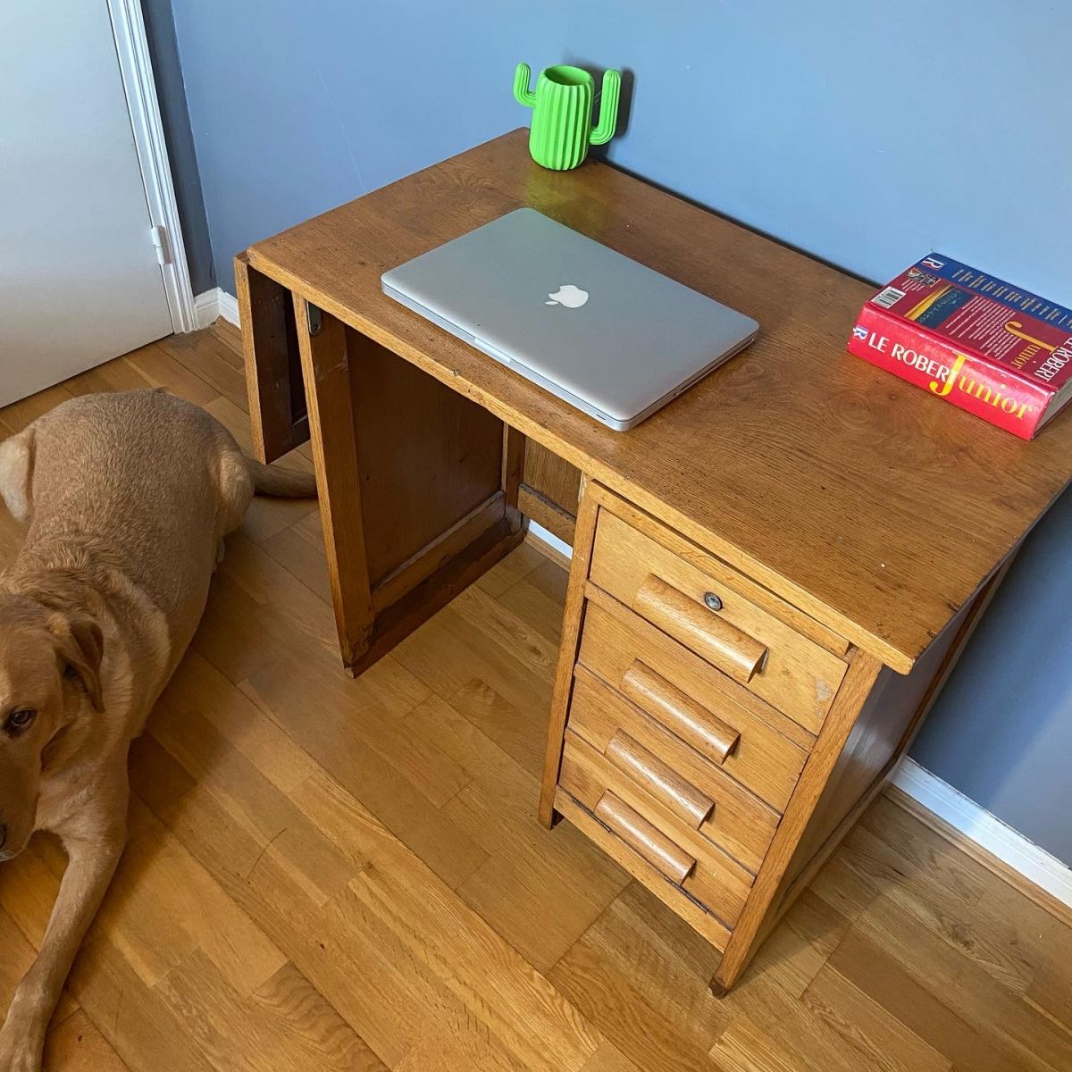 Charmant petit bureau en chêne miel, idéal pour un enfant de primaire. Il est typique des années 40 ou 50 avec son caisson, sa tirette et sa rallonge latérale. C'est le petit frère du bureau d'administration de l'époque ou du «bureau maitre d’école ». À noter: le propriétaire précédent a surélevé les pieds latéraux de 5 cm afin qu’on puisse utiliser une chaise d’adulte et que l’enfant puisse profiter un peu plus longtemps de son bureau. 2 équerres ont été vissées sous le plateau pour renforcer la structure. Des traces du temps mais quel charme !!! (voir photos). Le prix tient compte de ces petits défauts. Très jolie patine. Hauteur 73 cm - plateau 80 X 45 cm - plateau ouvert avec le rabat 111 X 45 cm - environ 18 kg.