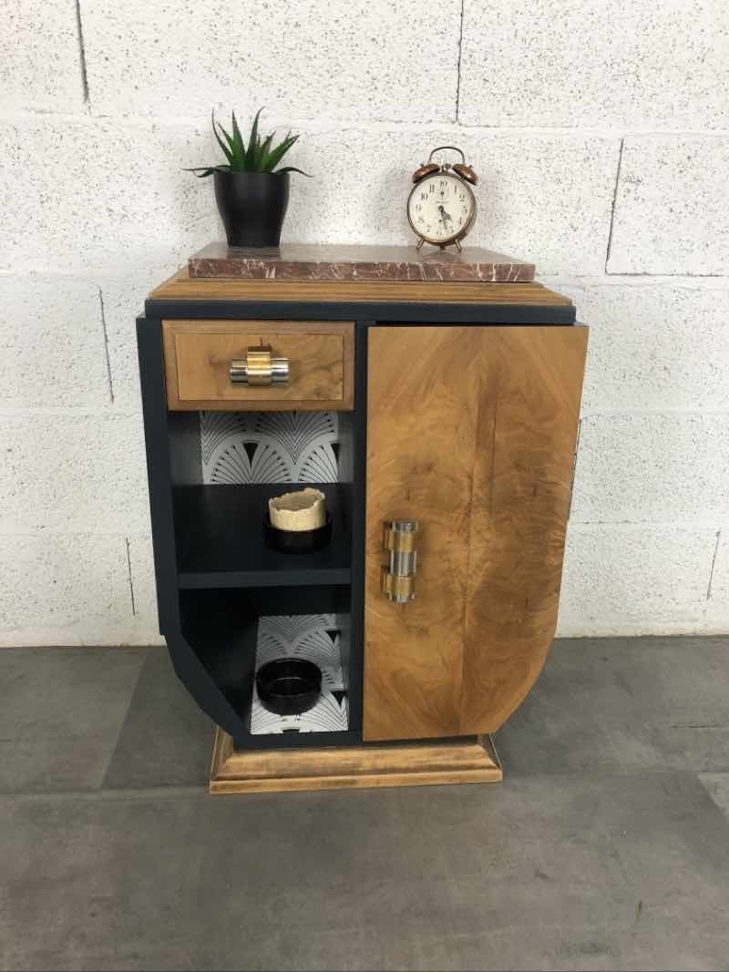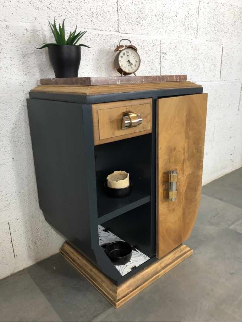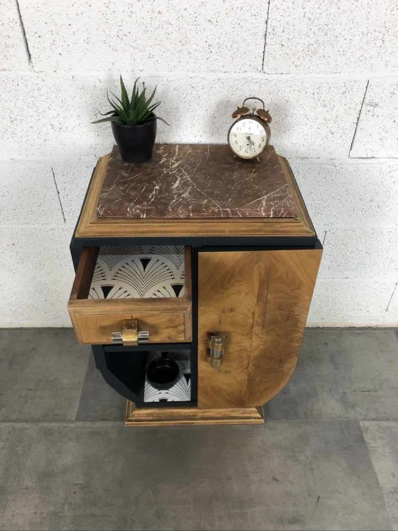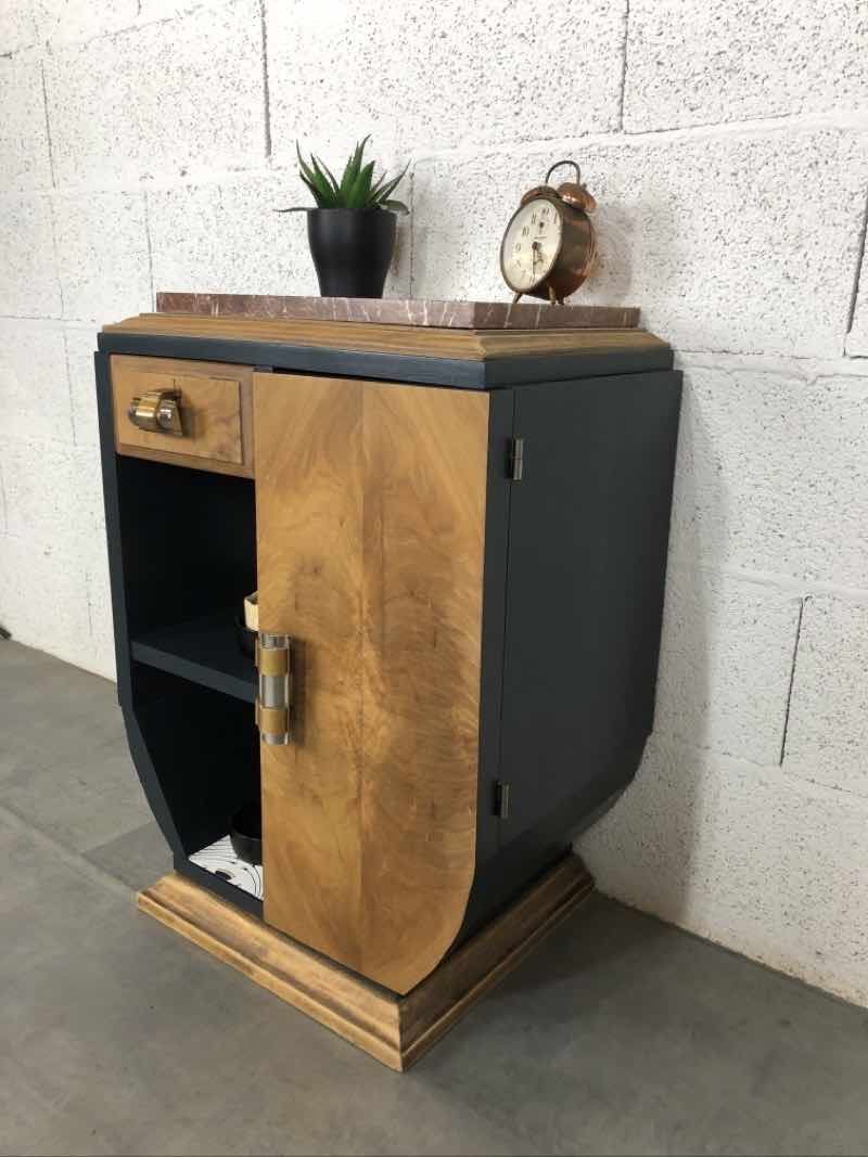 Table de chevet Art Déco en bois noir et bois ciré, plateau marbre en parfait état