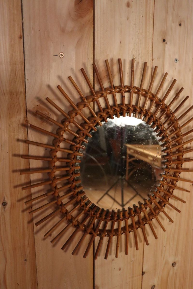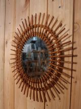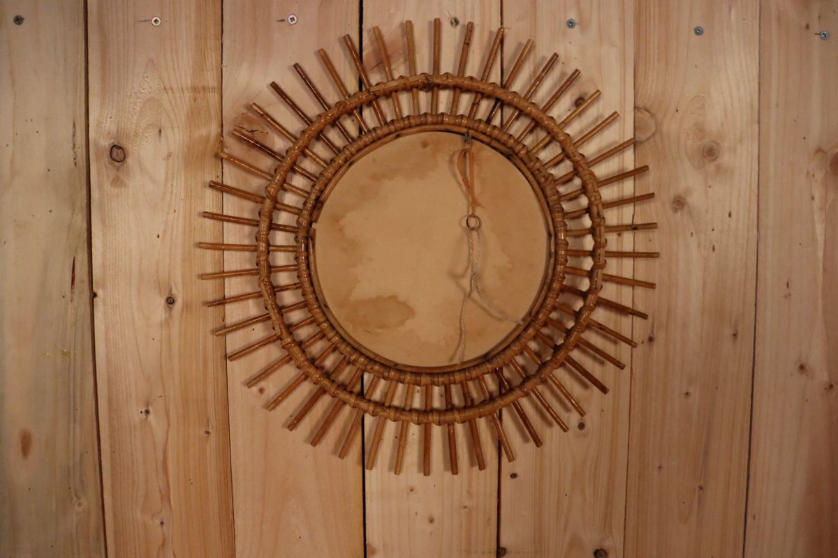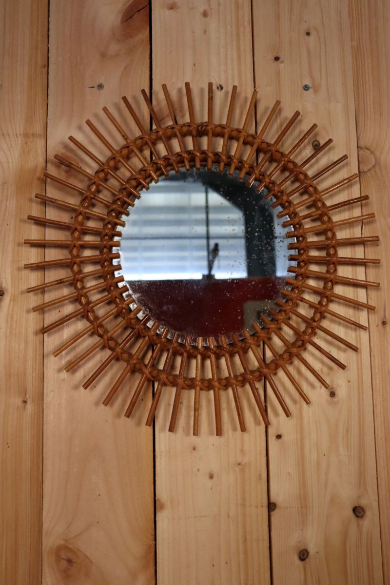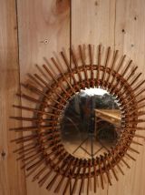 Miroir soleil en rotin, bel état général miroir au centre est légèrement biseauté sur un de ces cotés. 49 cm de diamètre total. Quelques légères piqûres sur le miroir, ce qui n'enlève en rien le reflet et qui lui donne son charmes authentique vintage. Emballage soigné et envoi en suivi. Mondial Relay/Cocolis/Colissimo.