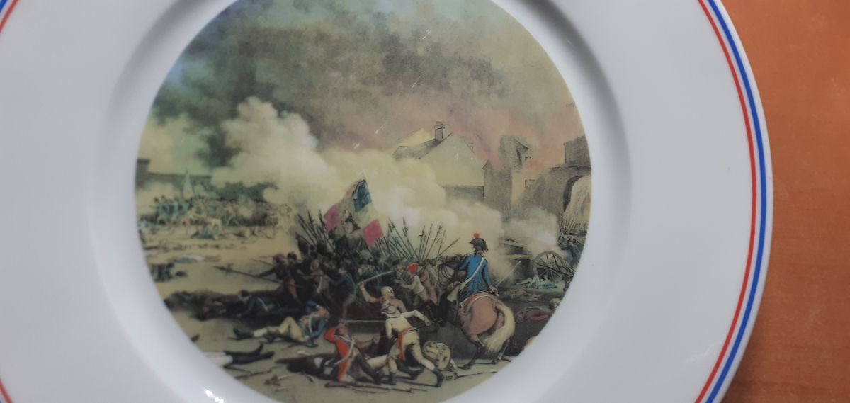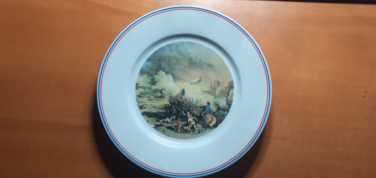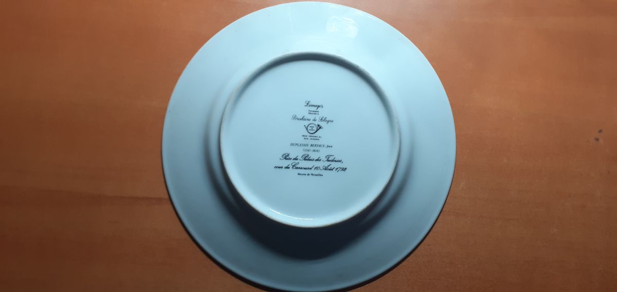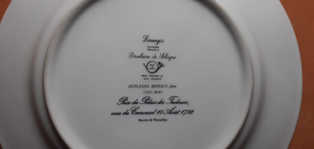 Marque : Assiette en Porcelaine de Sologne et décorée à Limoges. Diamètre 25 cm. Thème Prise du Palais des Tuileries de Duplessis Bertaux Jean (Musée de Versailles)