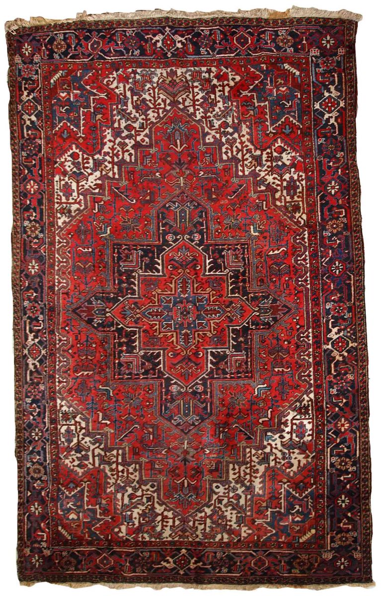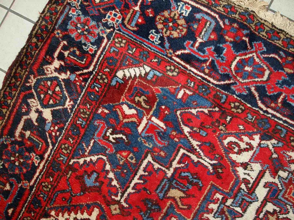 Handmade antique Heriz rug from the middle of 20th century. The rug is in original condition, it has some low pile.