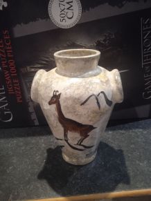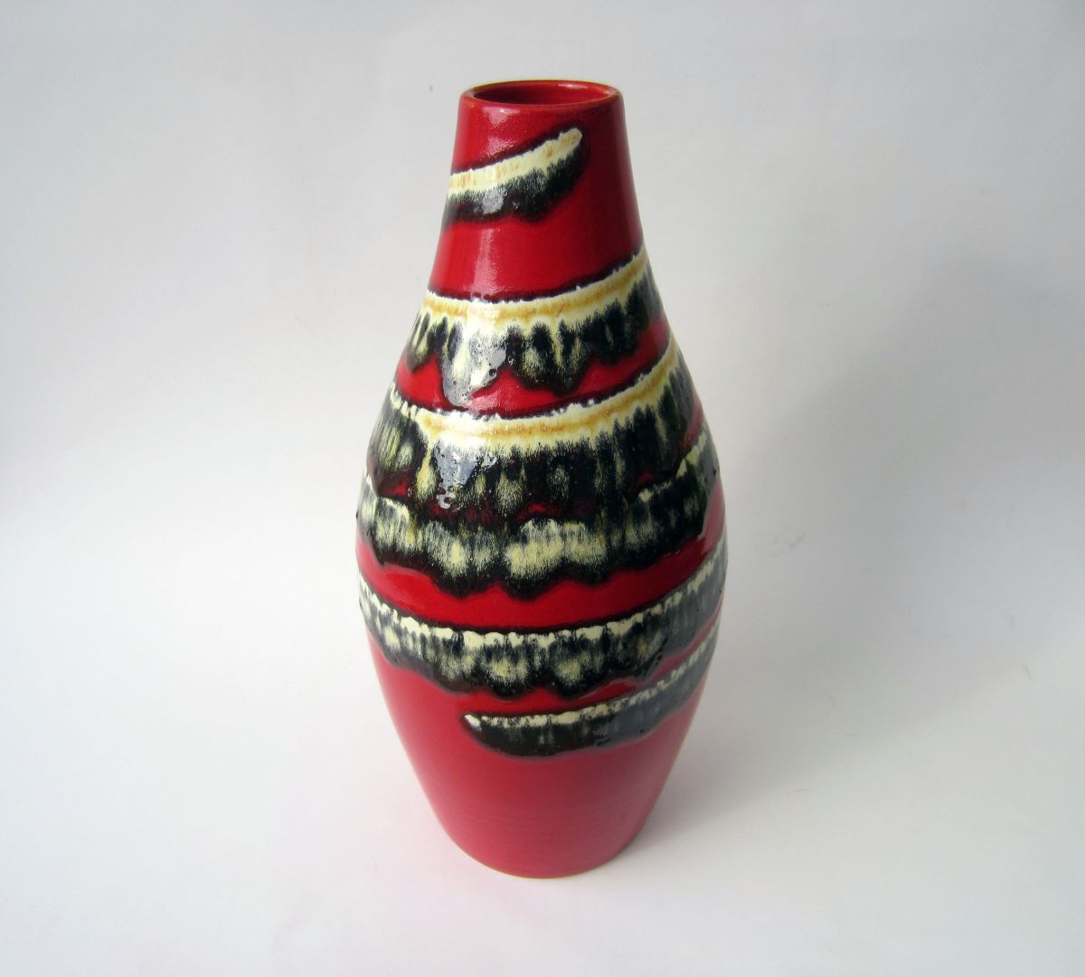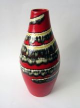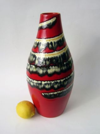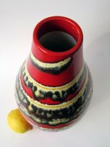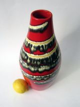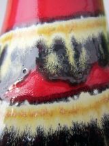 Superbe grand VASE en céramique décoré dans le style fat lava avec une espèce de ‘’ruban’’ dans les tons crème, jaune et noir sur fond rouge. Pas d’indication de fabricant mais un beau travail très décoratif.