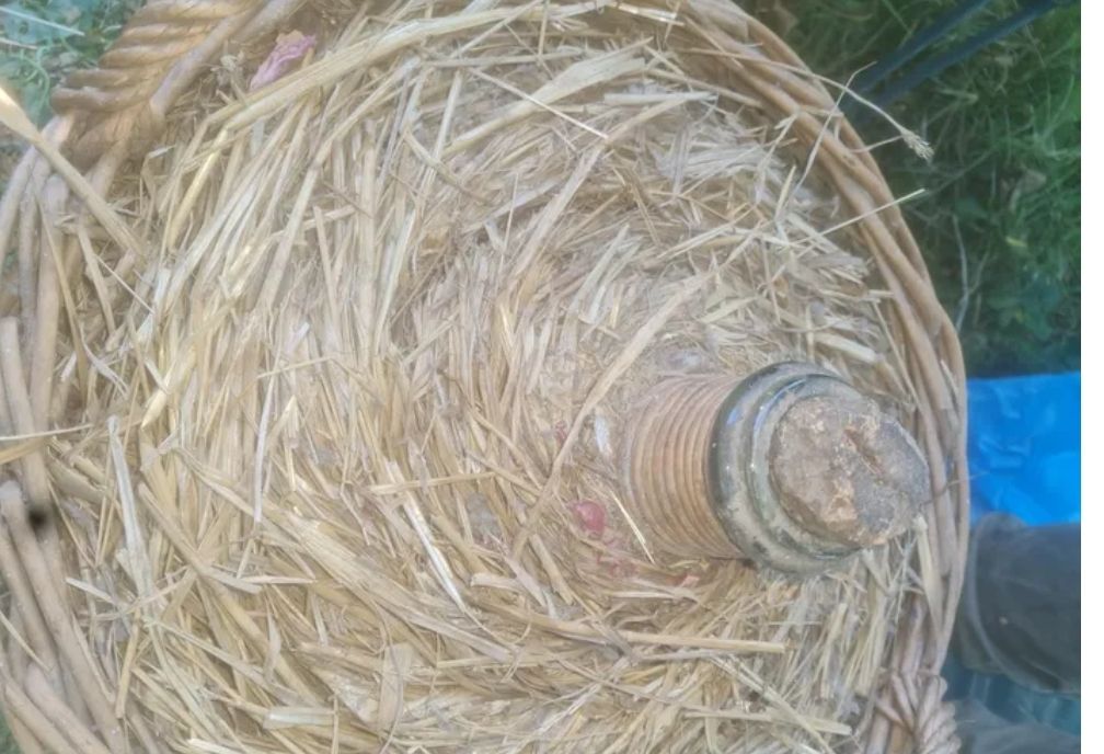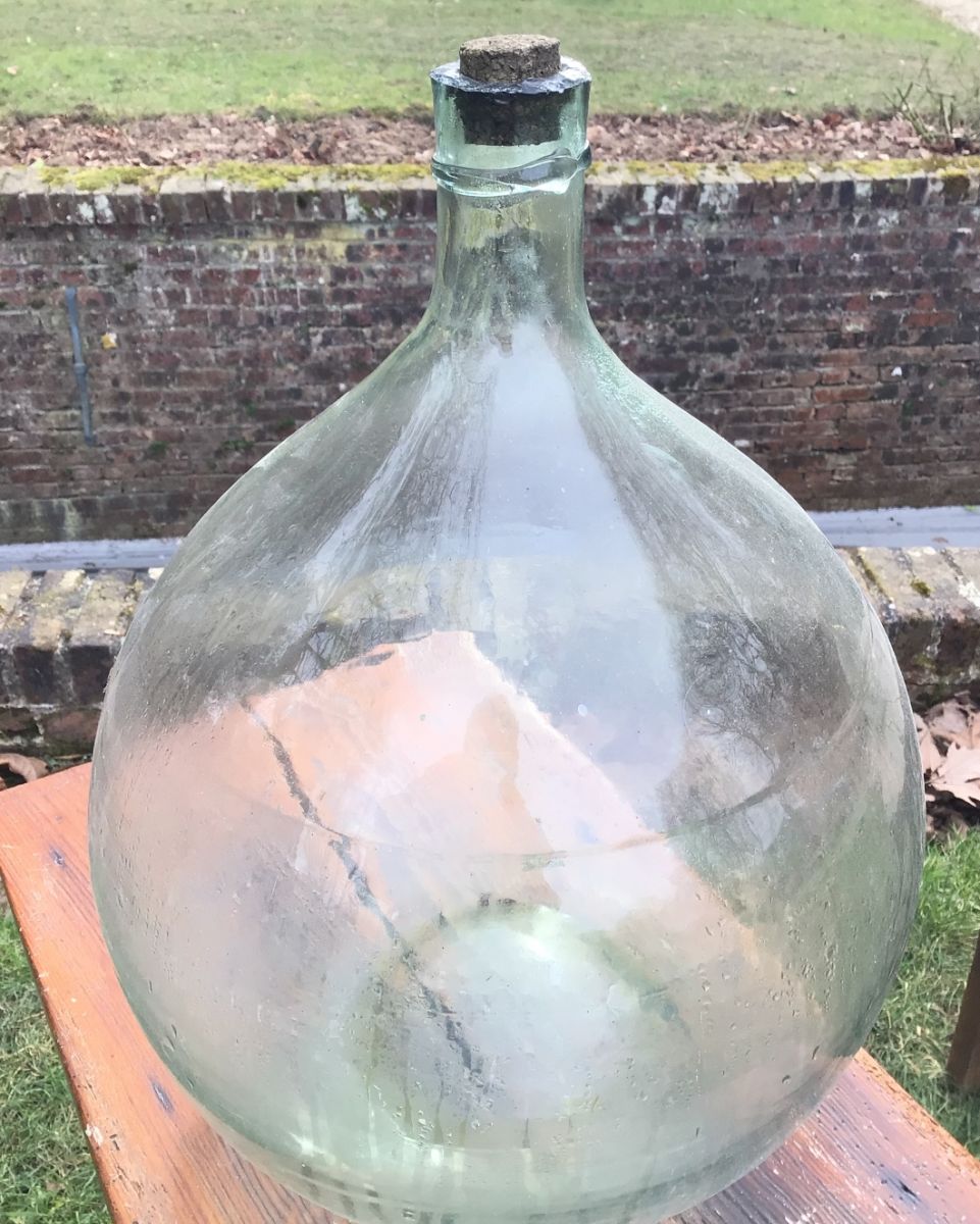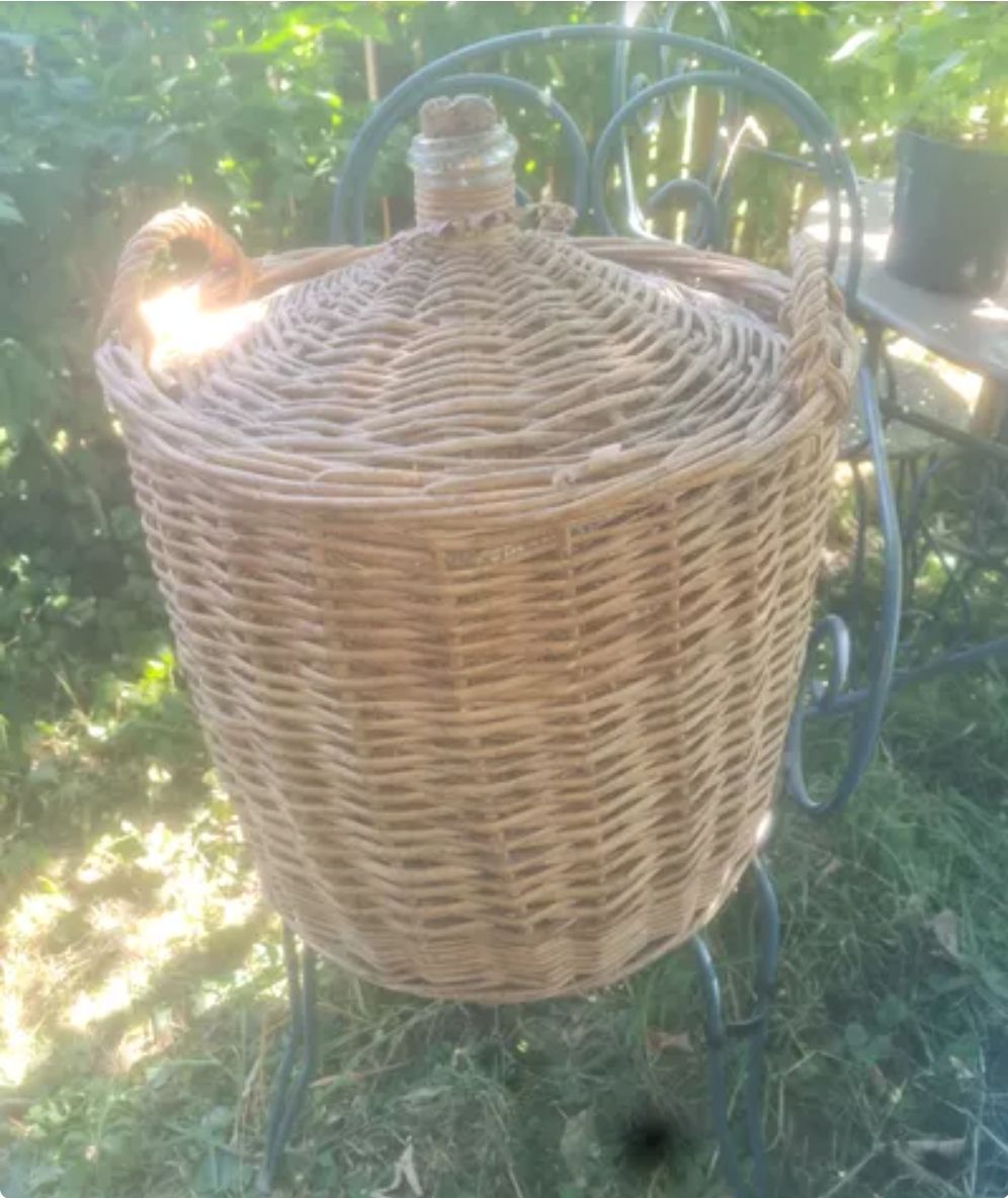Dame jeanne en.verre blanc dzns sont panier très bon état vue la paille autour