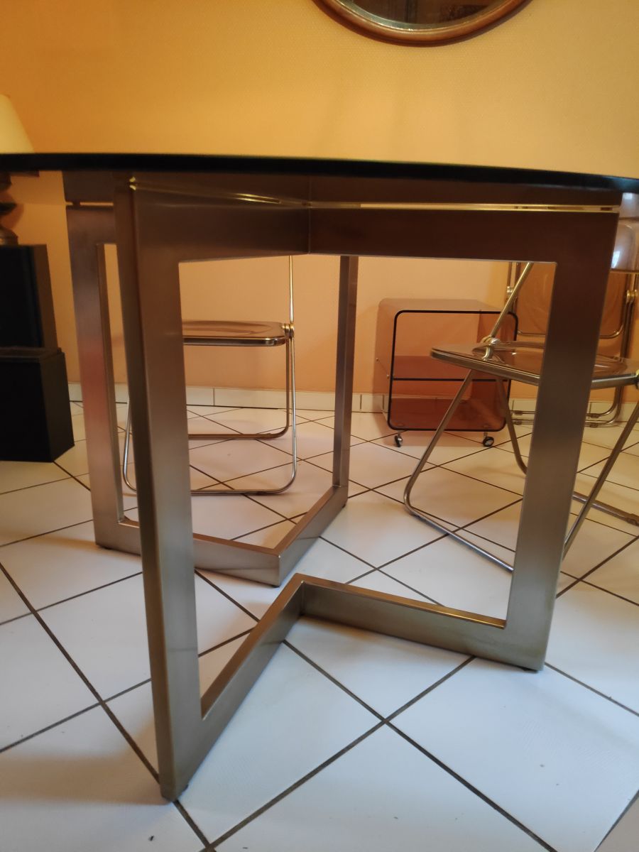 Table en verre 6 personnes. Années 70. Plateau en verre fumé et pietement en alu brossé. Probablement acheté chez Roche Bobois ou Castrelli à l'époque. Très bon état, mais traces d'usure normales ( quelques rayures très légères sur la table)