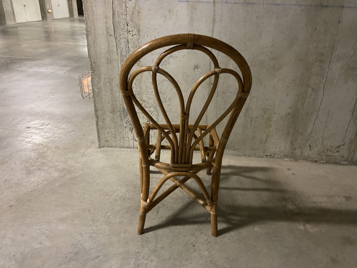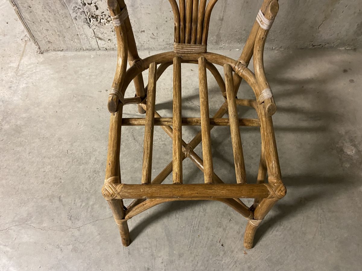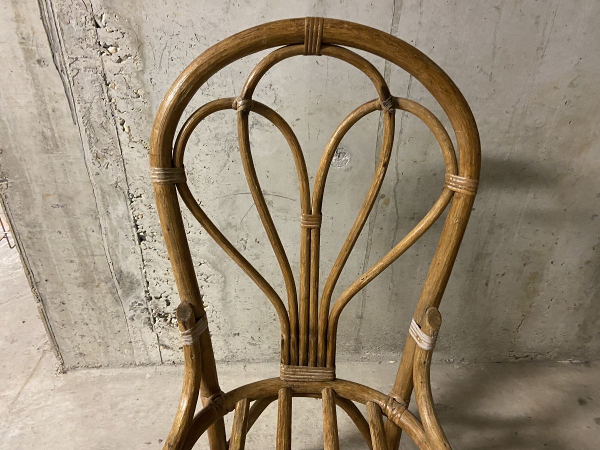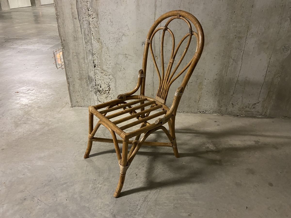 Chaise « peacock » en rotin des années 60, aspect brut à revernir ou non, très stable et solide, hauteur totale 91cm, hauteur assise 38cm, assise 40x40cm, bon état.