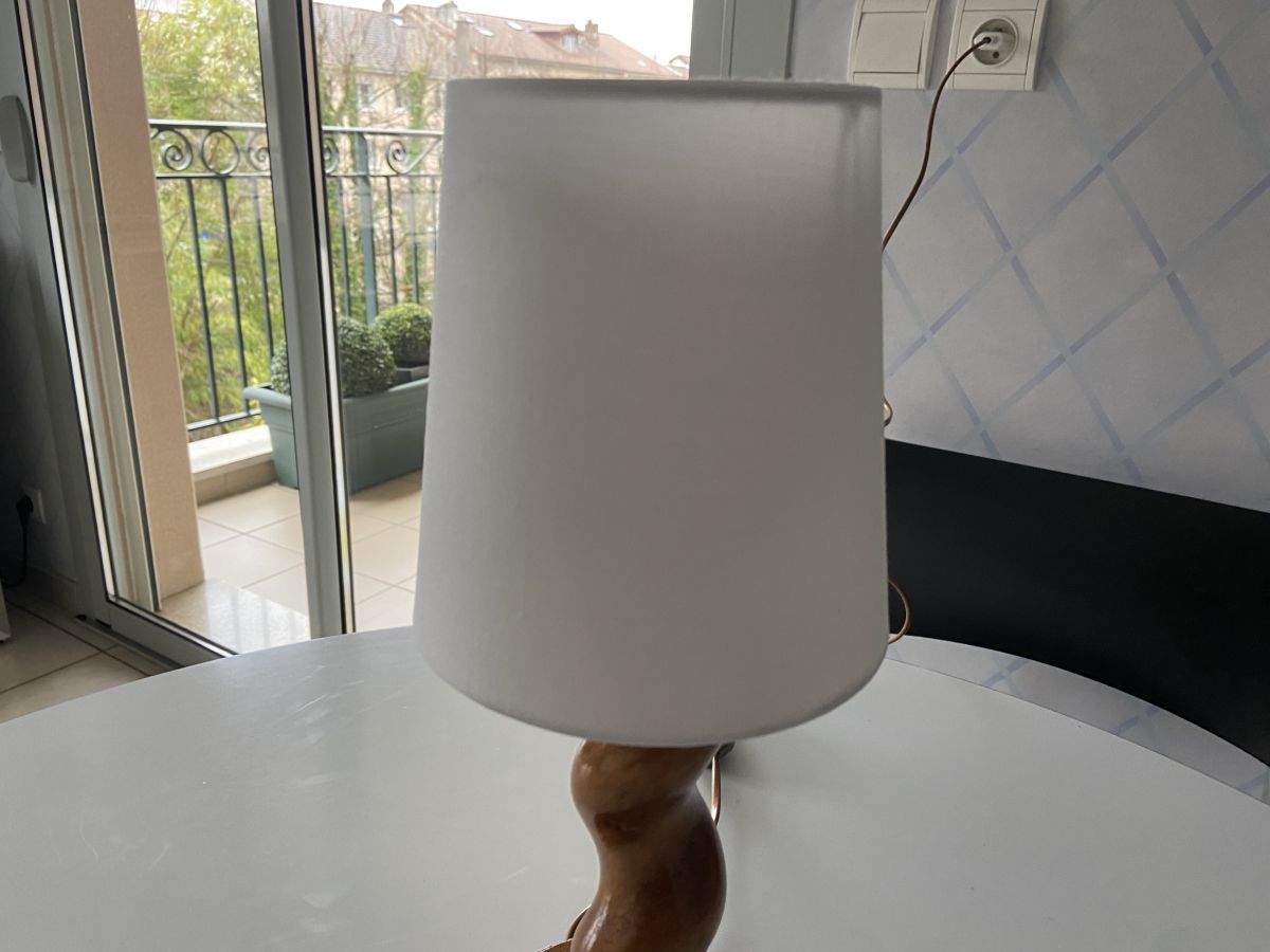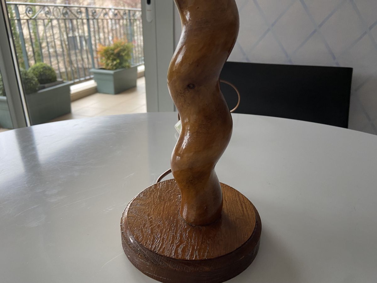 Lampe en bois brutaliste des années 70, vernie, abat-jour neuf, fonctionne parfaitement, ampoule baïonnette, hauteur 38cm, diamètre abat-jour 14cm, diamètre socle 14cm, très bon état.