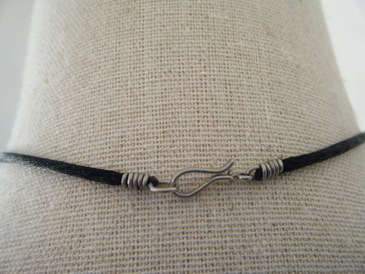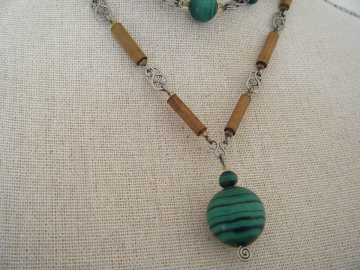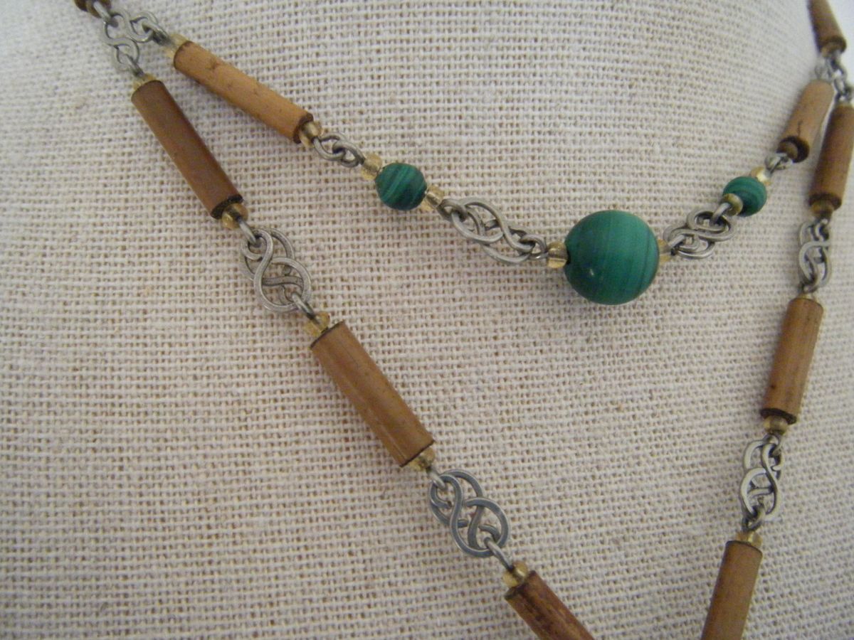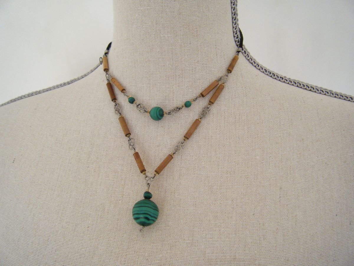 En malachite (perles vertes), bambou et métal avec un cordon noir