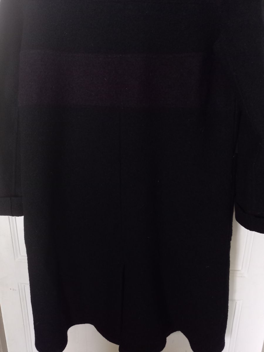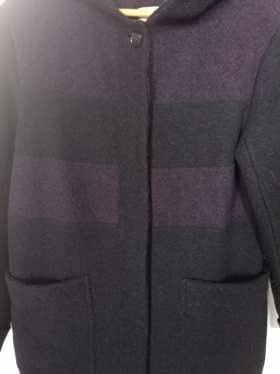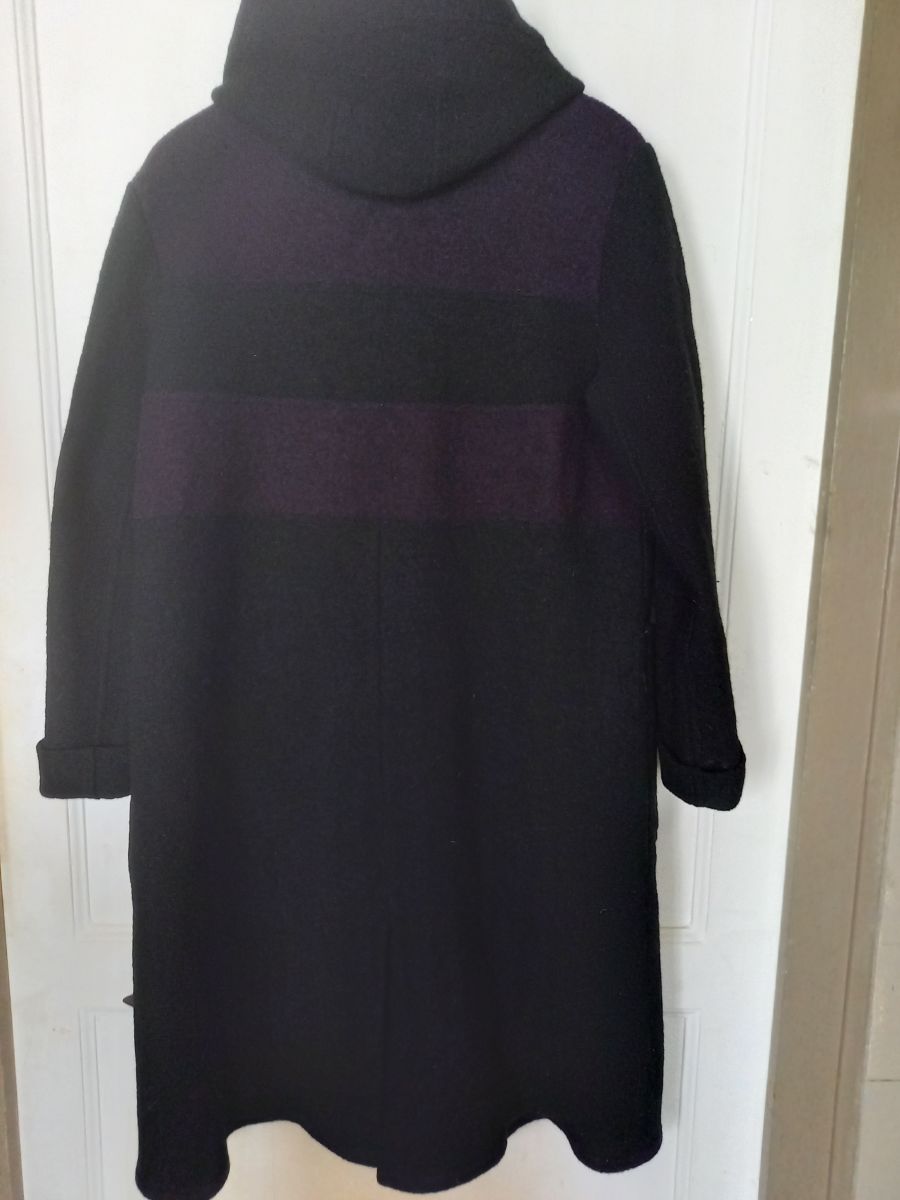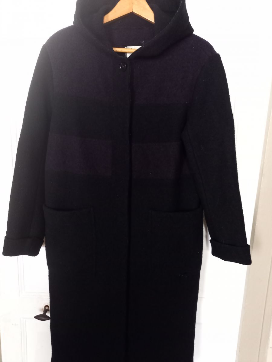 Manteau en laine bouillie noire avec large bande lie de vin, fermeture par boutons pression cachés sous patte, grandes poches et capuche