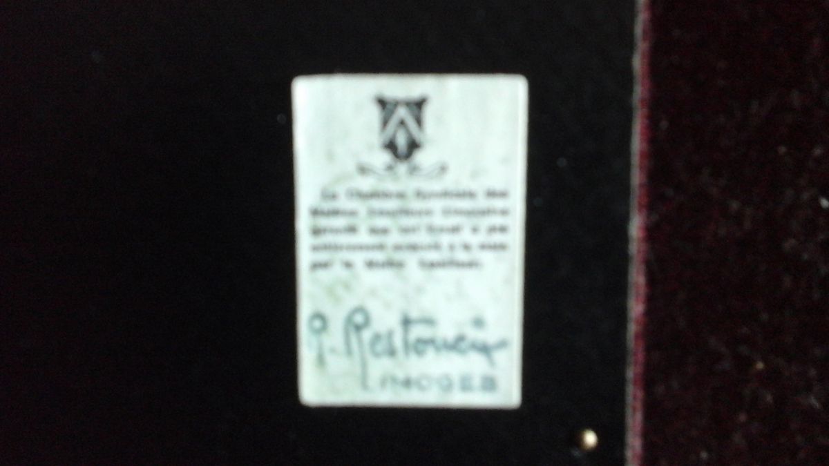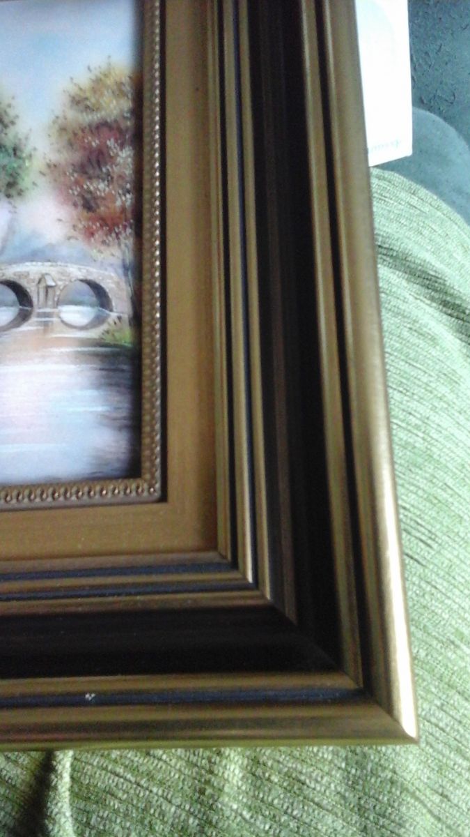 Cadre doré, tableau représentant une maison au bord d'une rivière enjambée par un pont. Couleurs d'automne. Élaboré par Restoueix, encadré par Pourieux.