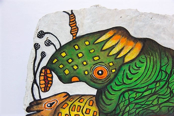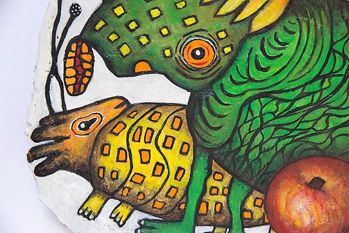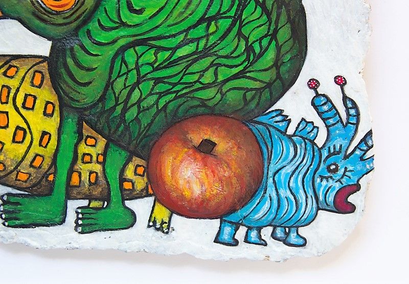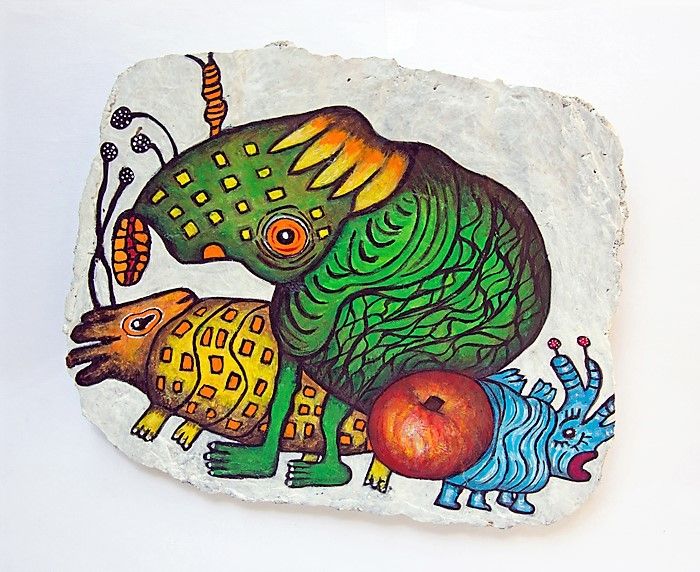 Peinture originale sur bloc de béton de ma fabrication. Art surréaliste, Dada, figuration libre, outsider art. Inspiration Jerome Bosch