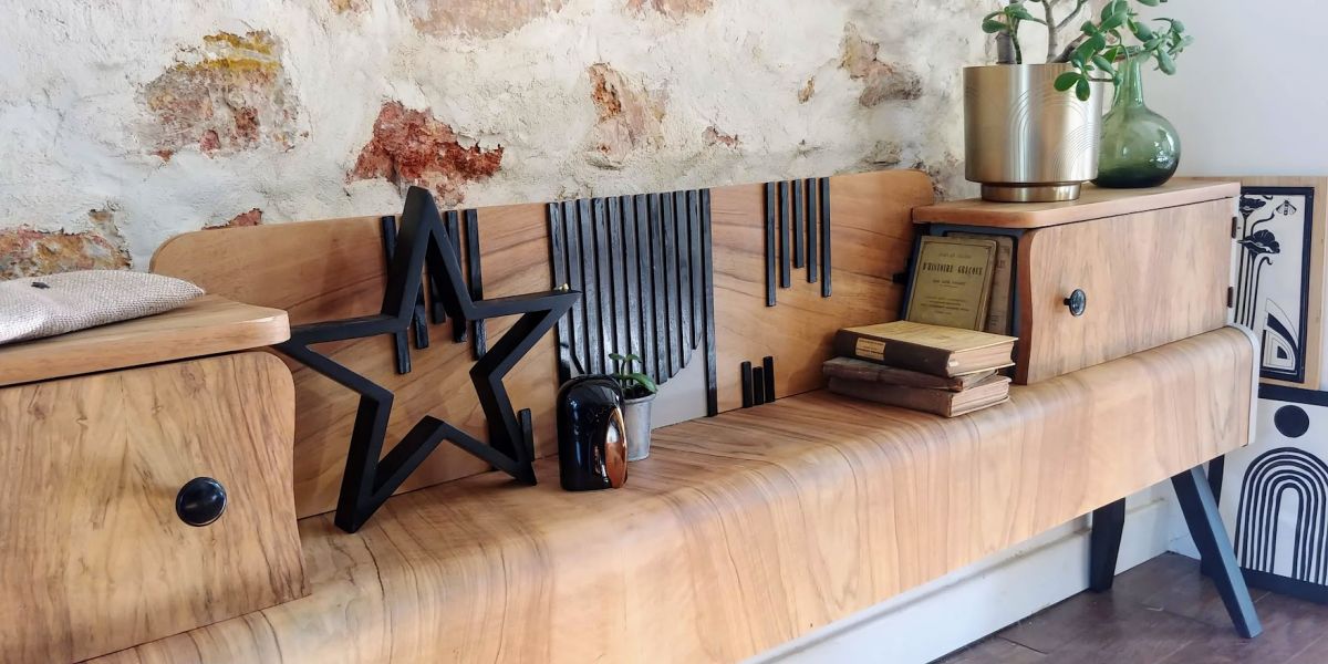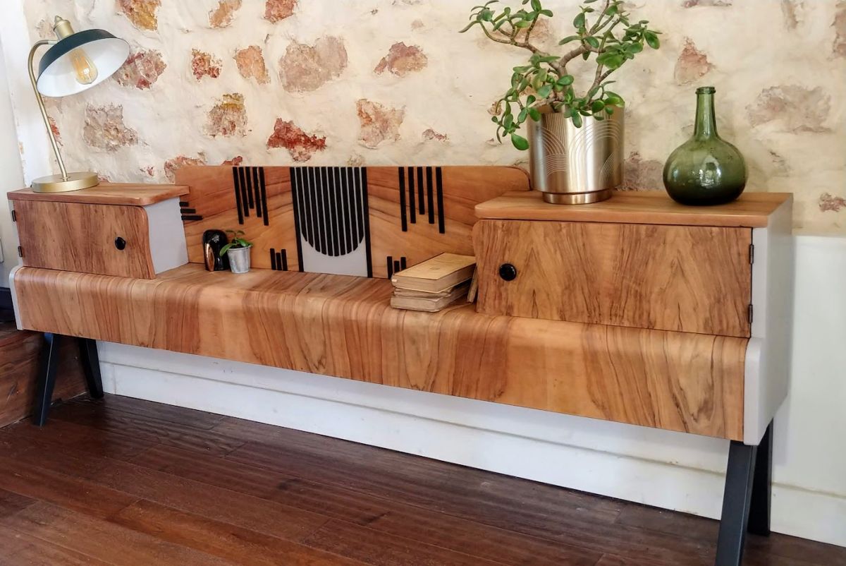 Ancien cosy des années 40/50, cette longue étagère en bois a été rénovée et détournée avec un style art déco et épuré.