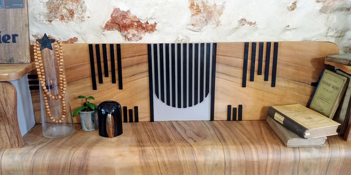 Le placage d’origine est mis en valeur, ses couleurs graphiques, le noir et le gris argile s’associent à un motif en relief. Ces rayures et arches inspirés d'arrondis et de formes retro revisitent ce design « art déco » de manière très contemporaine.