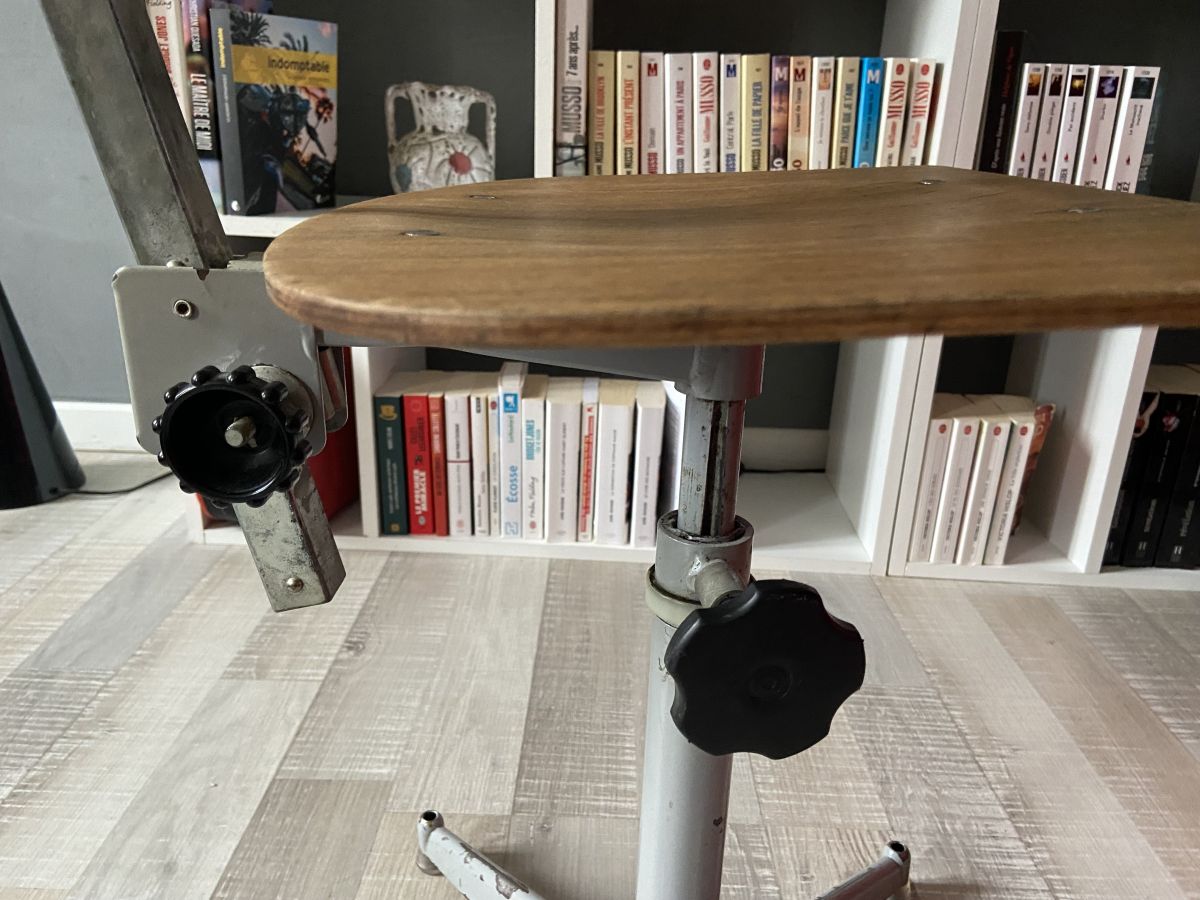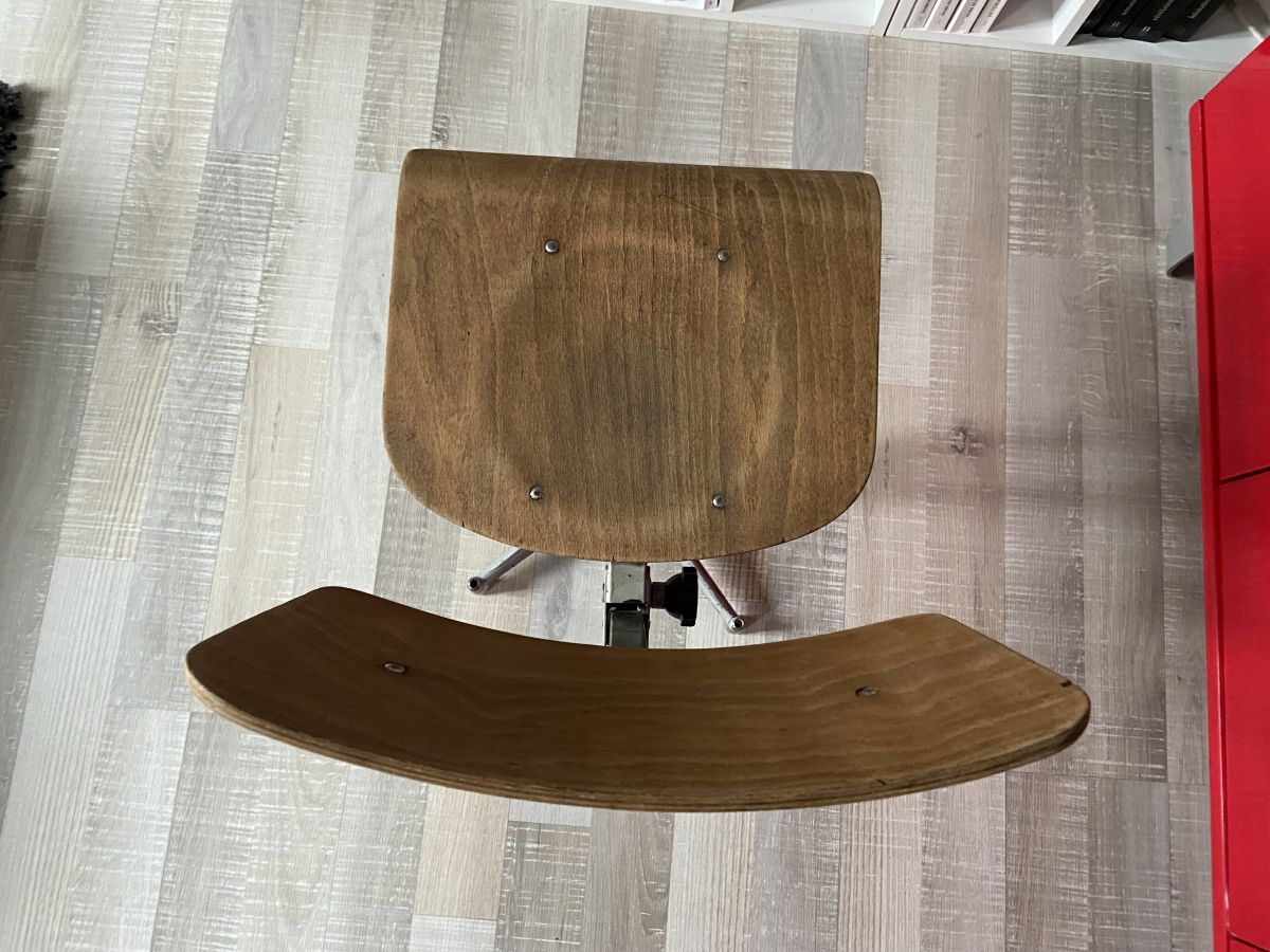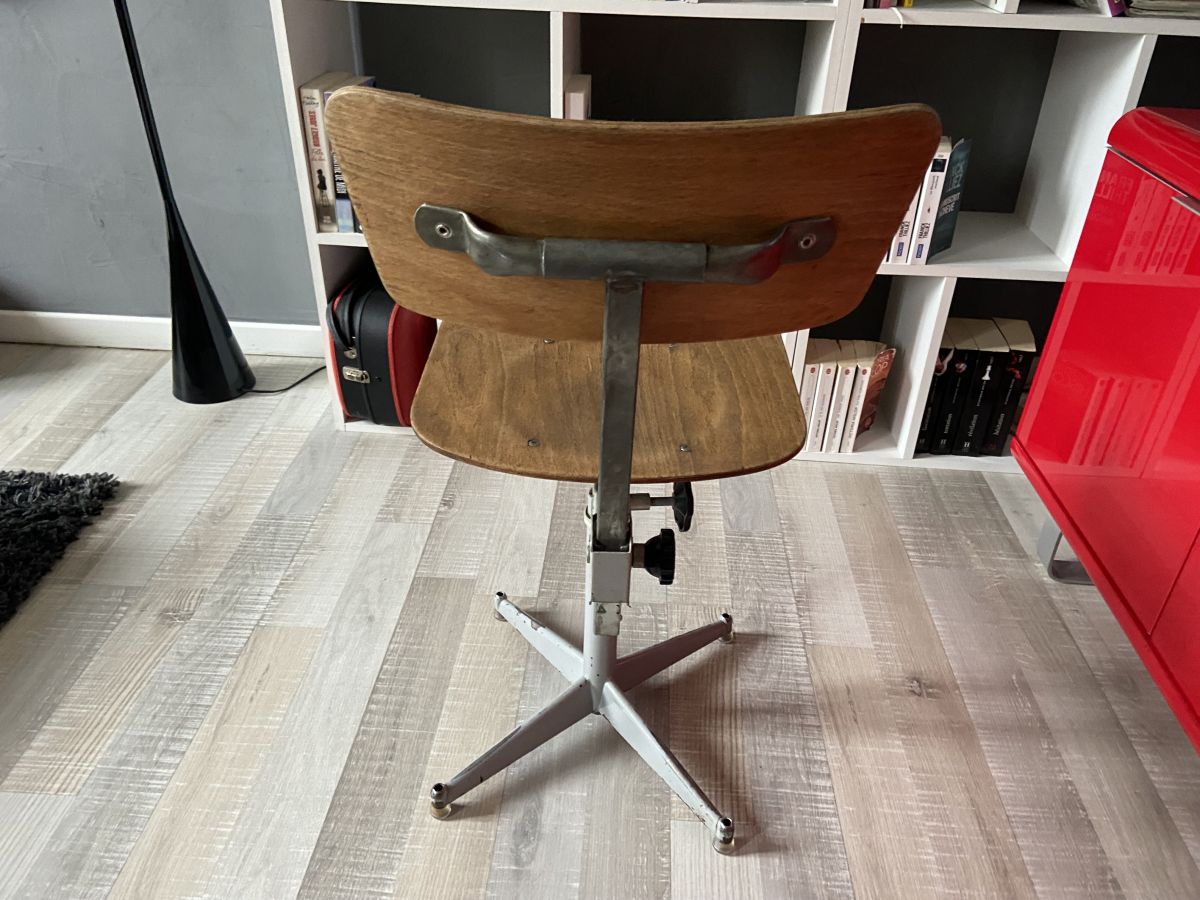 Chaise d'atelier des années 60 en bois et métal tubulaire gris, réglable en hauteur par mollette, dossier également réglable en hauteur, quelques éclats sur la peinture (laissés volontairement pour conserver le charme et l'esprit de la chaise), hauteur totale de 73 à 91cm, hauteur assise de 41 à 60cm, assise 38x35cm.