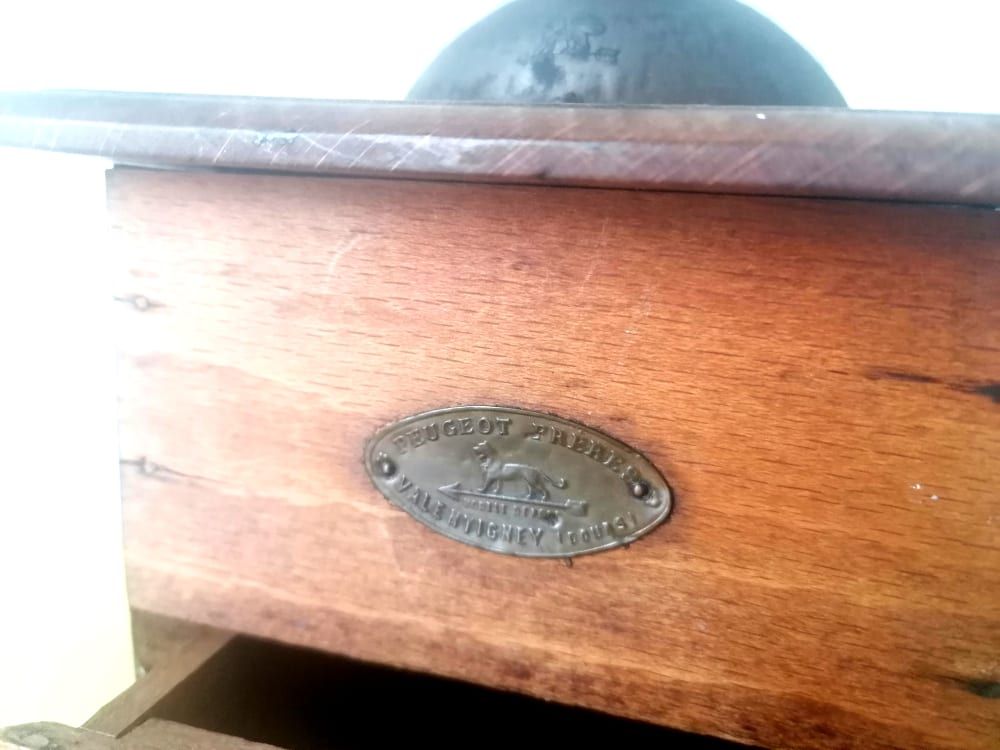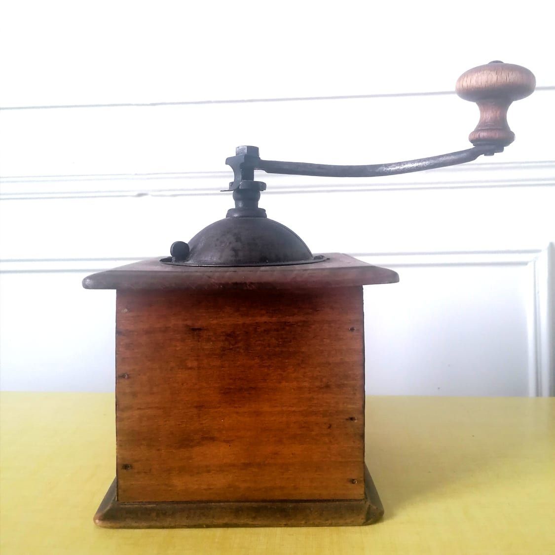 Moulin à café ancien de la marque Peugeot Frères. Moulin en bois cubique, à manivelle avec prise en bois toupie, un tiroir en façade.