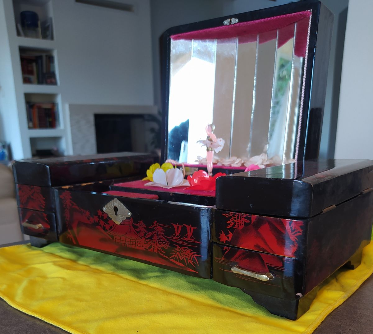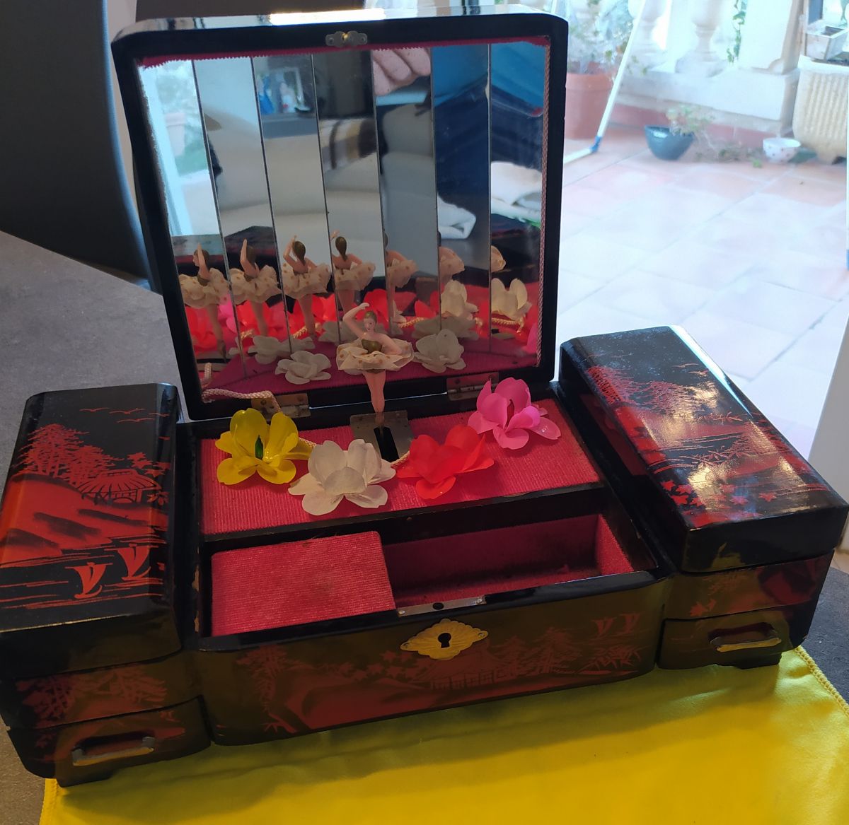 Vends boite a bijoux musicale avec figurine de danse remontable ,trois compartiments et trois tiroirs -tres beaux motifs en laque rouge.