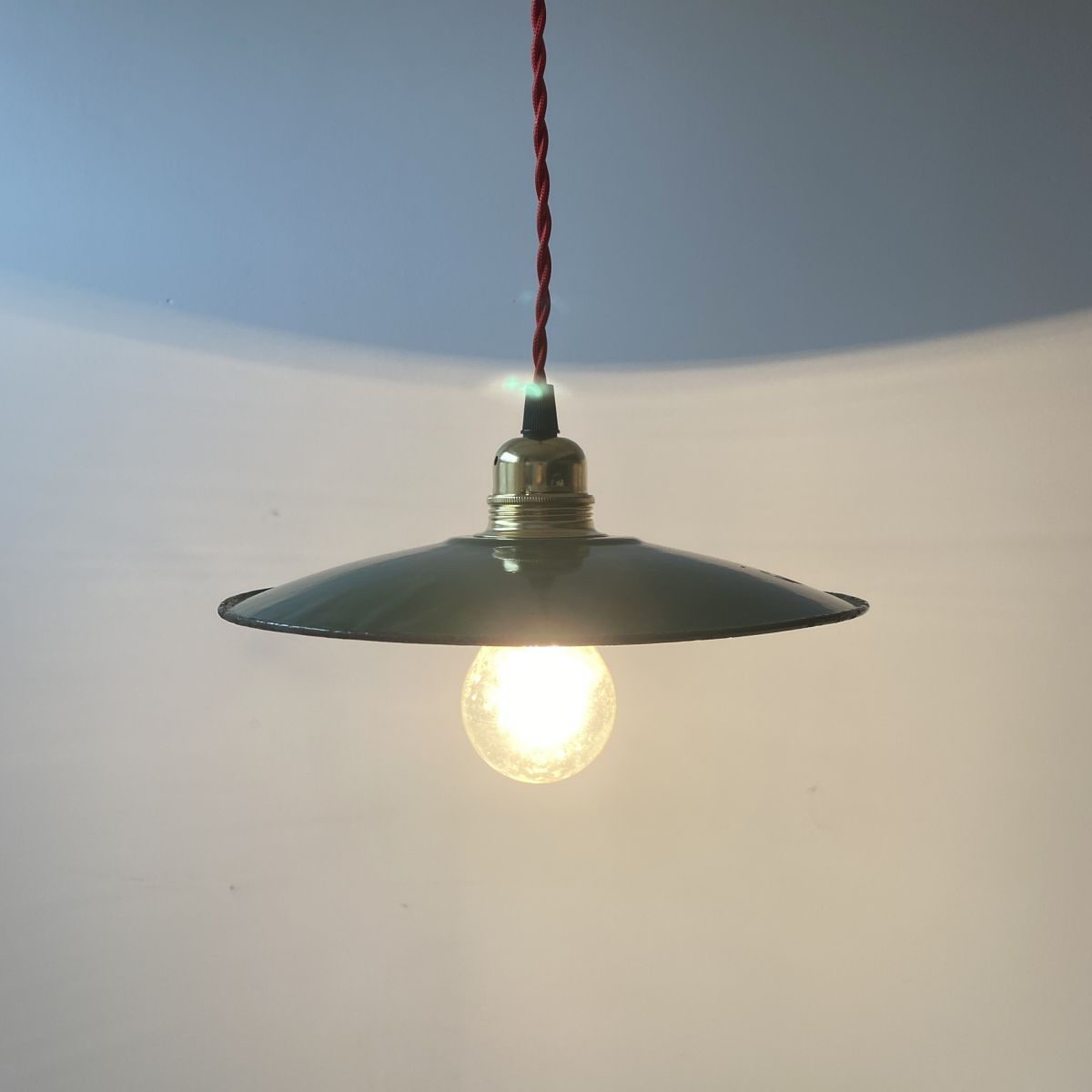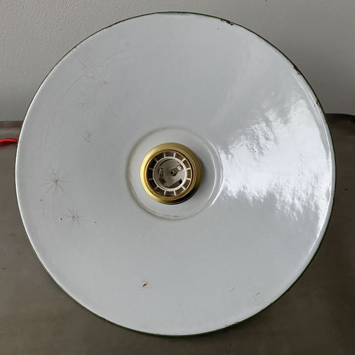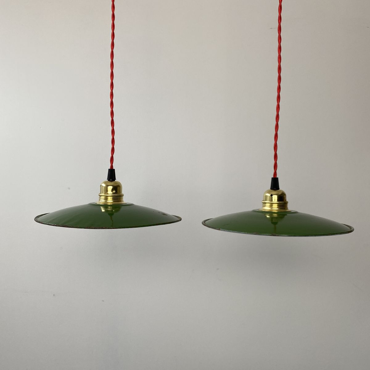 2 suspensions en tôle émaillée verte. Années 1950. En bel état malgré quelques sauts d’émail et traces de rouille.