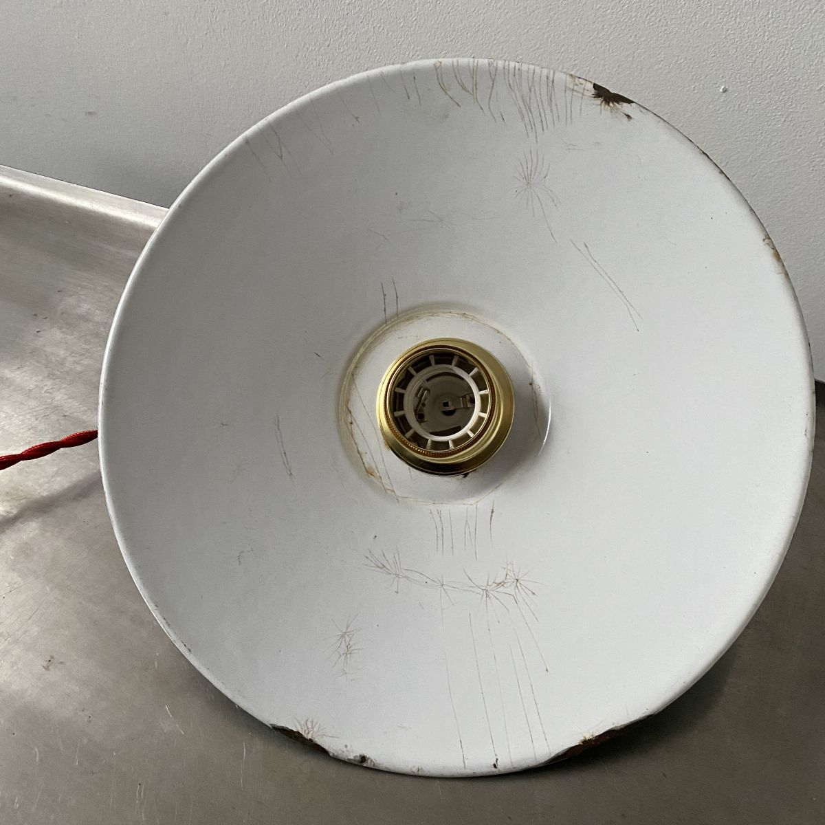 L’électricité a été refaite (Ampoules E27). Branchement par domino. Fil rouge en tissu tressé et rosace de fixation en porcelaine.
