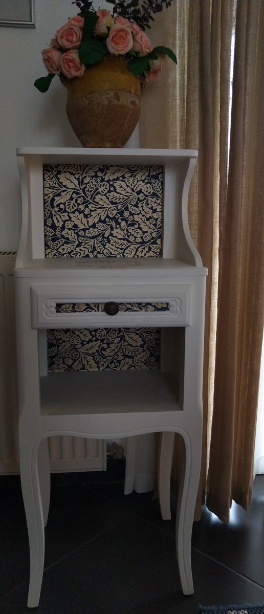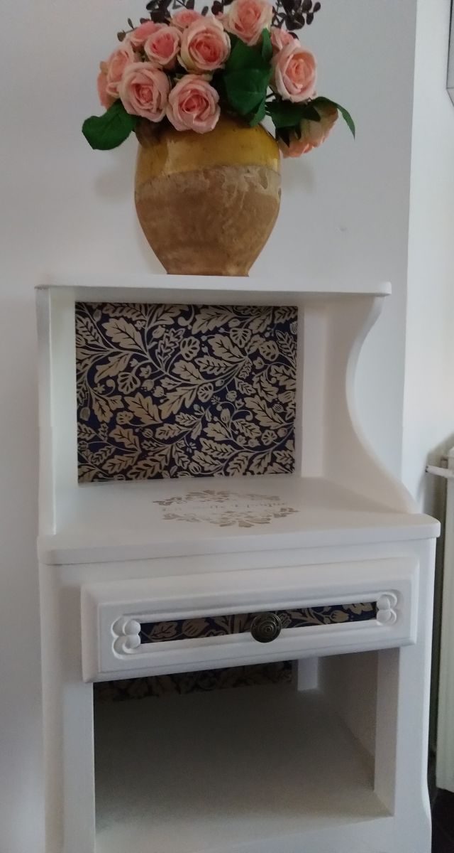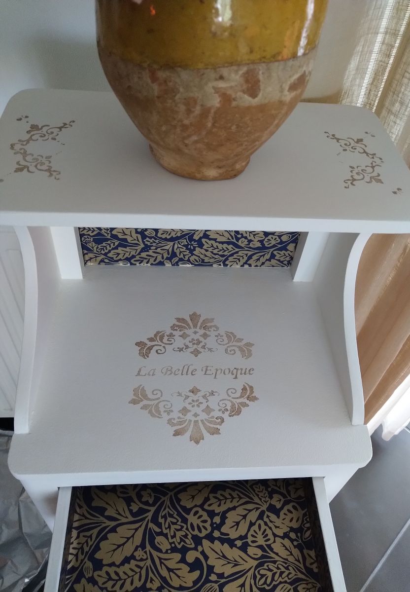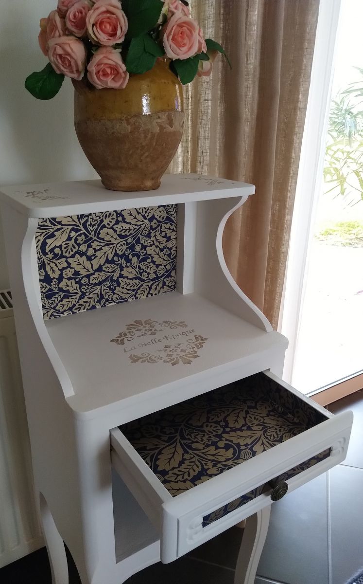 Console retravaillée en blanc Libéron, papier vinyl et pochoir. Son charme est aussi dans ses dimensions, elle peut être installée partout, dans une entrée, en bout de canapé, comme meuble de décoration...