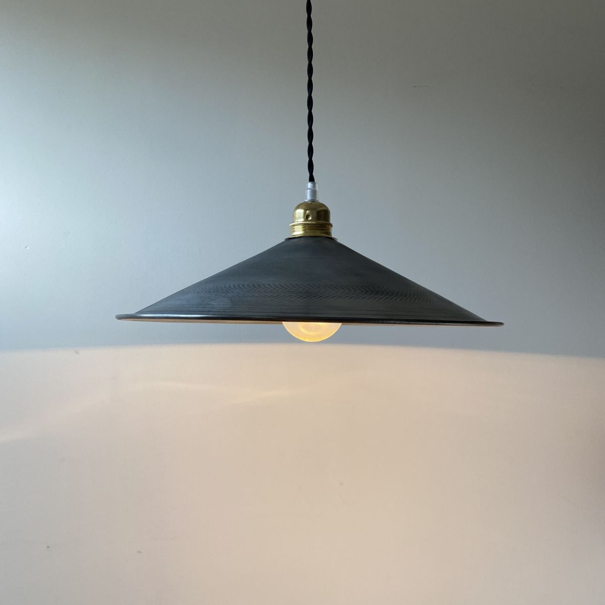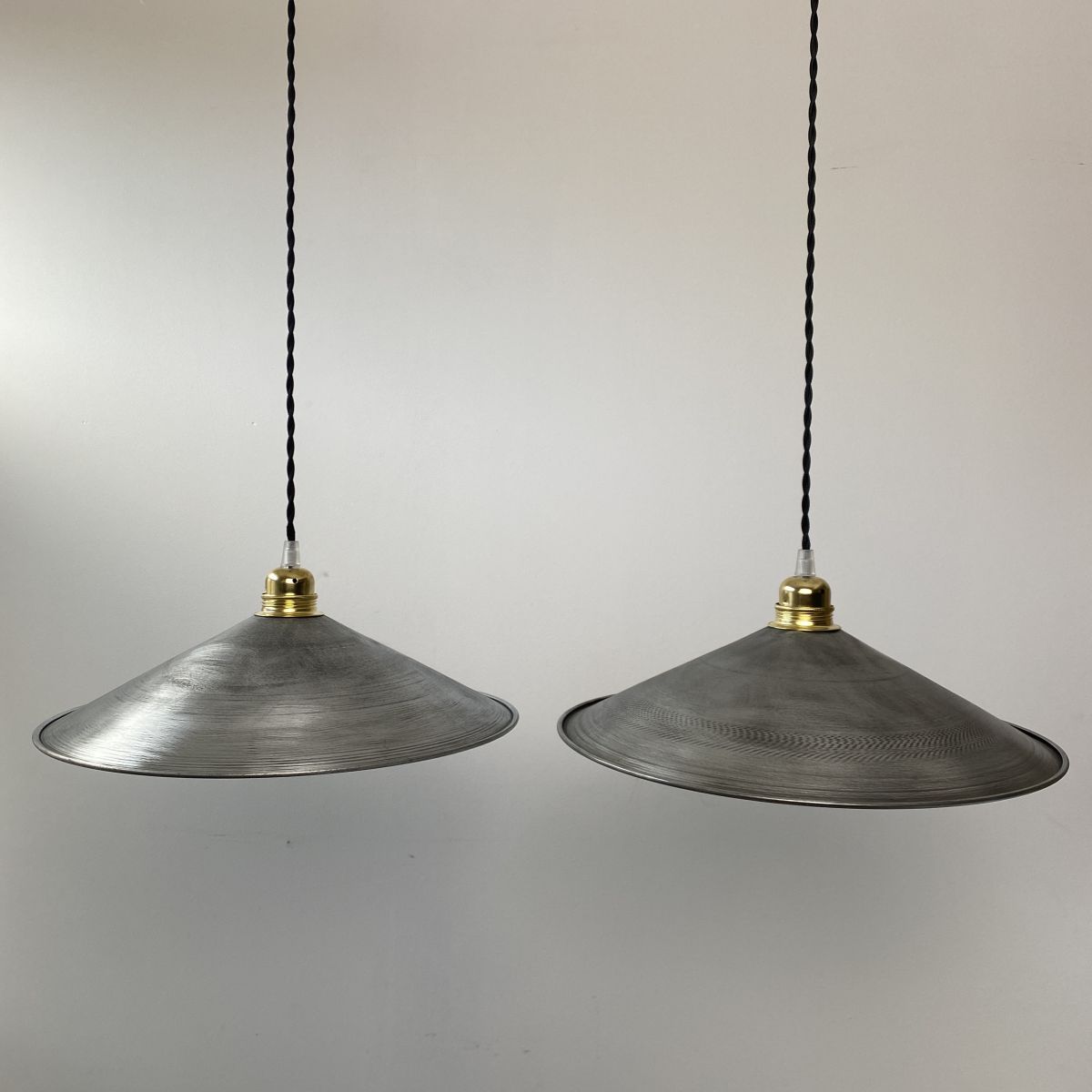 2 rares suspensions légèrement coniques en acier. Années 1950. En très bel état. L’une est plus lourde que la seconde.