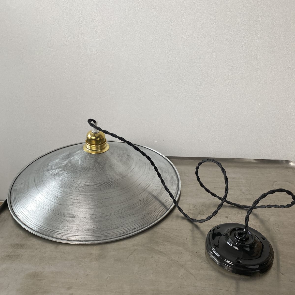 Elles ont été poncées pour retrouver le métal d’origine. L’électricité a été refaite (Ampoules E27). Branchement par domino. Fil noir en tissu tressé et rosace de fixation en porcelaine.