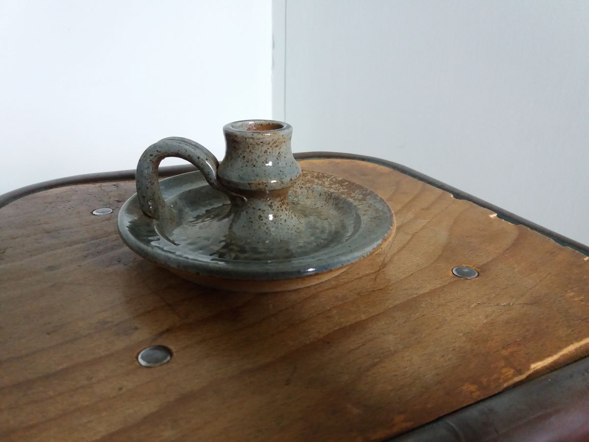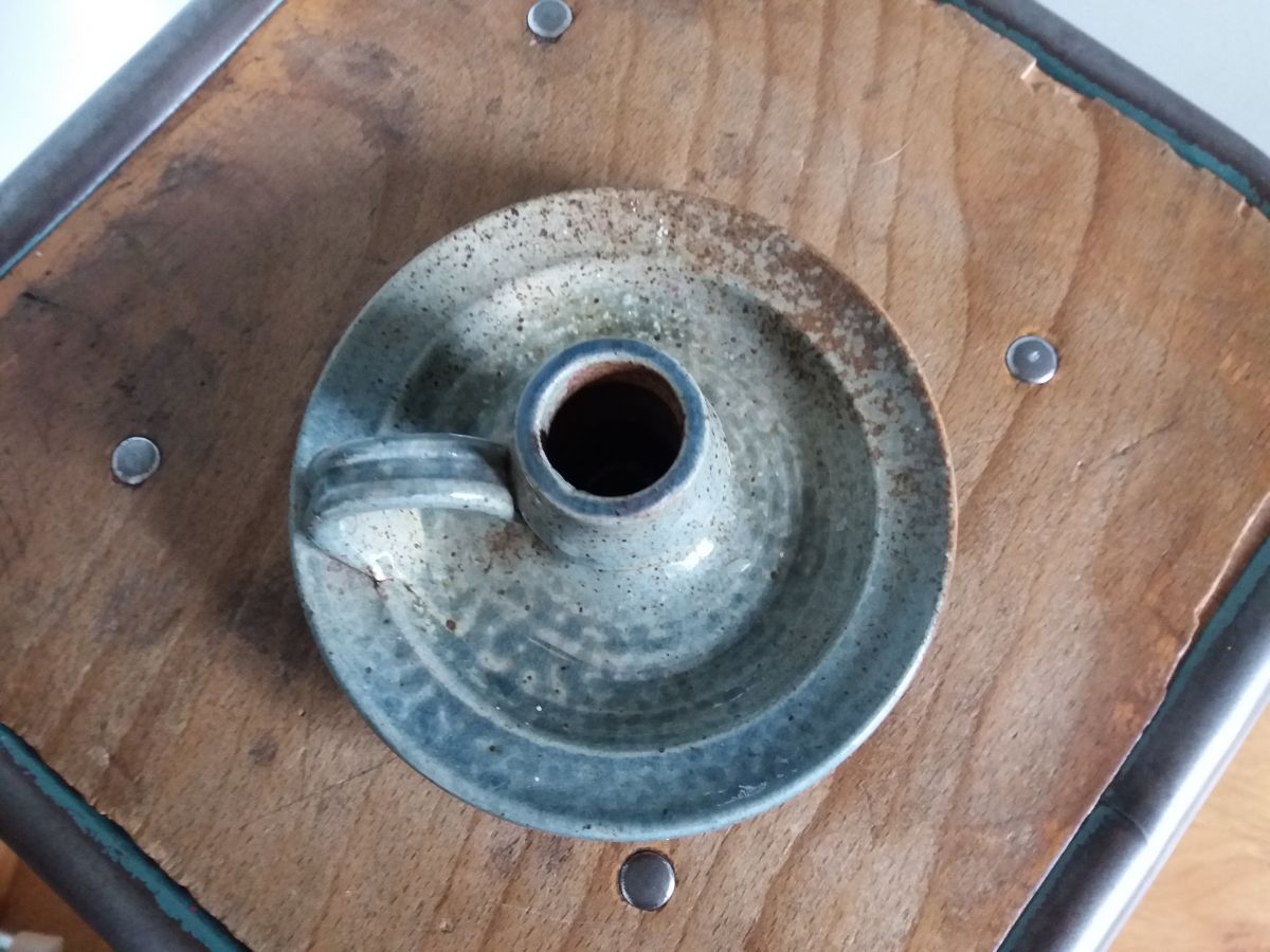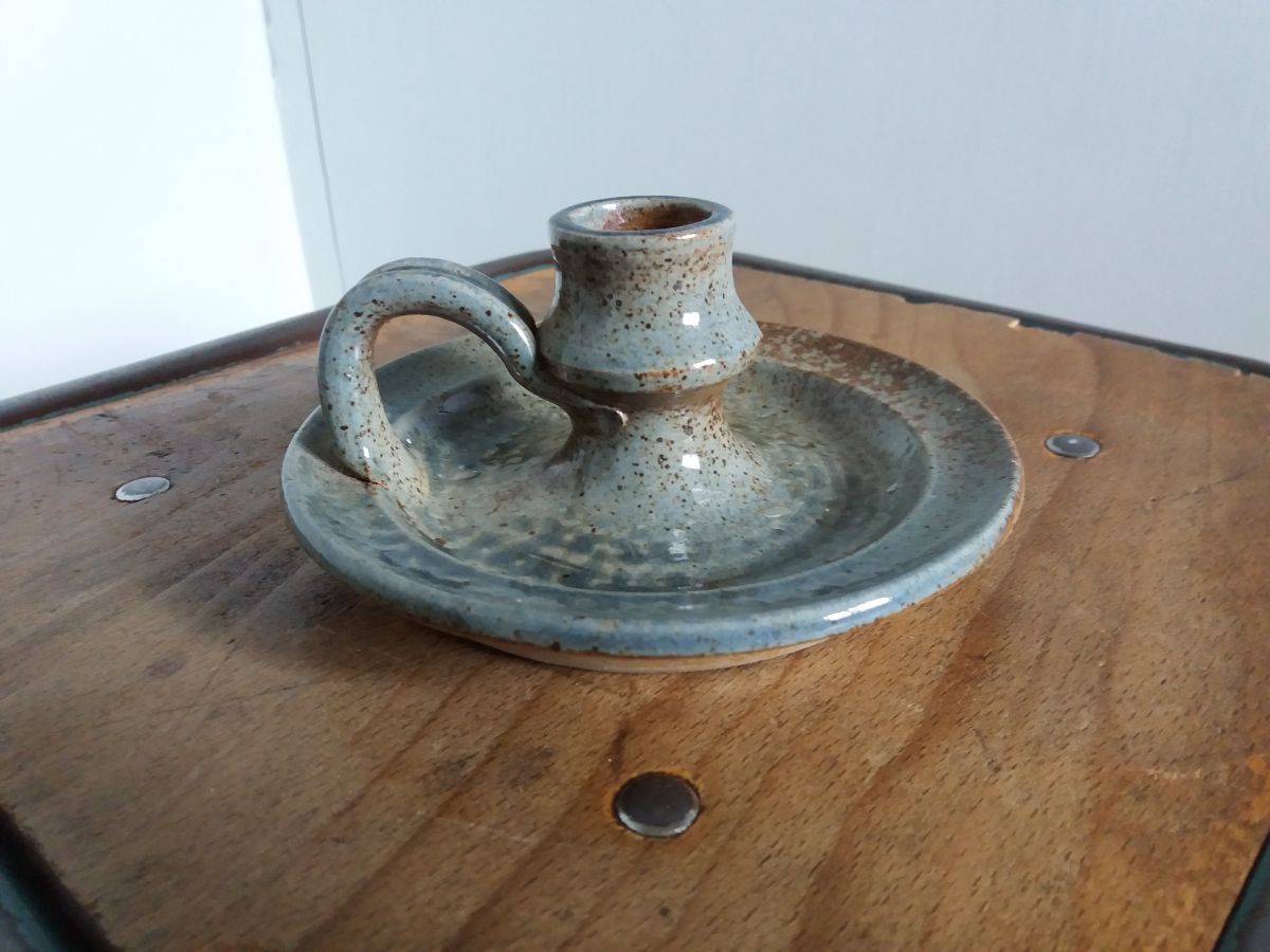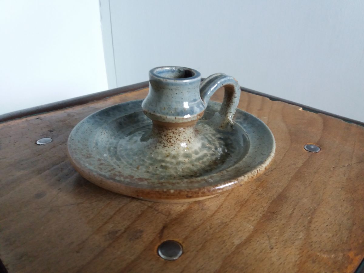 Joli bougeoir qu'on appelle « rat de cave » avec sa petite poignée et sa soucoupe pour recueillir la cire fondue. Il est en céramique (grès?) émaillée dans des couleurs douces, dans les tons bleu gris tacheté de marron.il est en très bon état, pas de fêle, juste une ou deux petites abrasions de l'émaillage, quasiment indétectable. Il mesure 14 cm de diamètre au niveau de la coupelle, 6 cm de hauteur. L'orifice pour recevoir la bougie mesure 2, 5 de diamètre. Il pèse 365 g.
