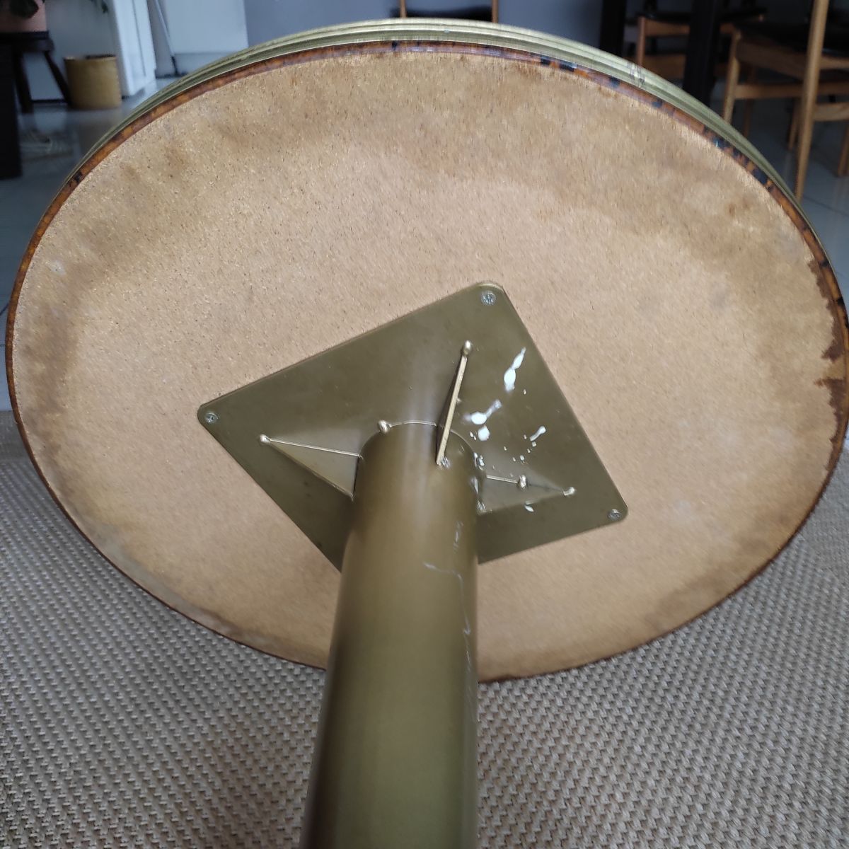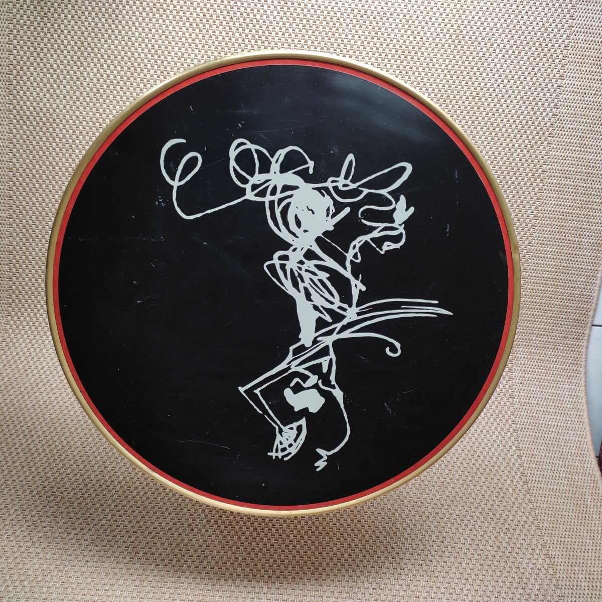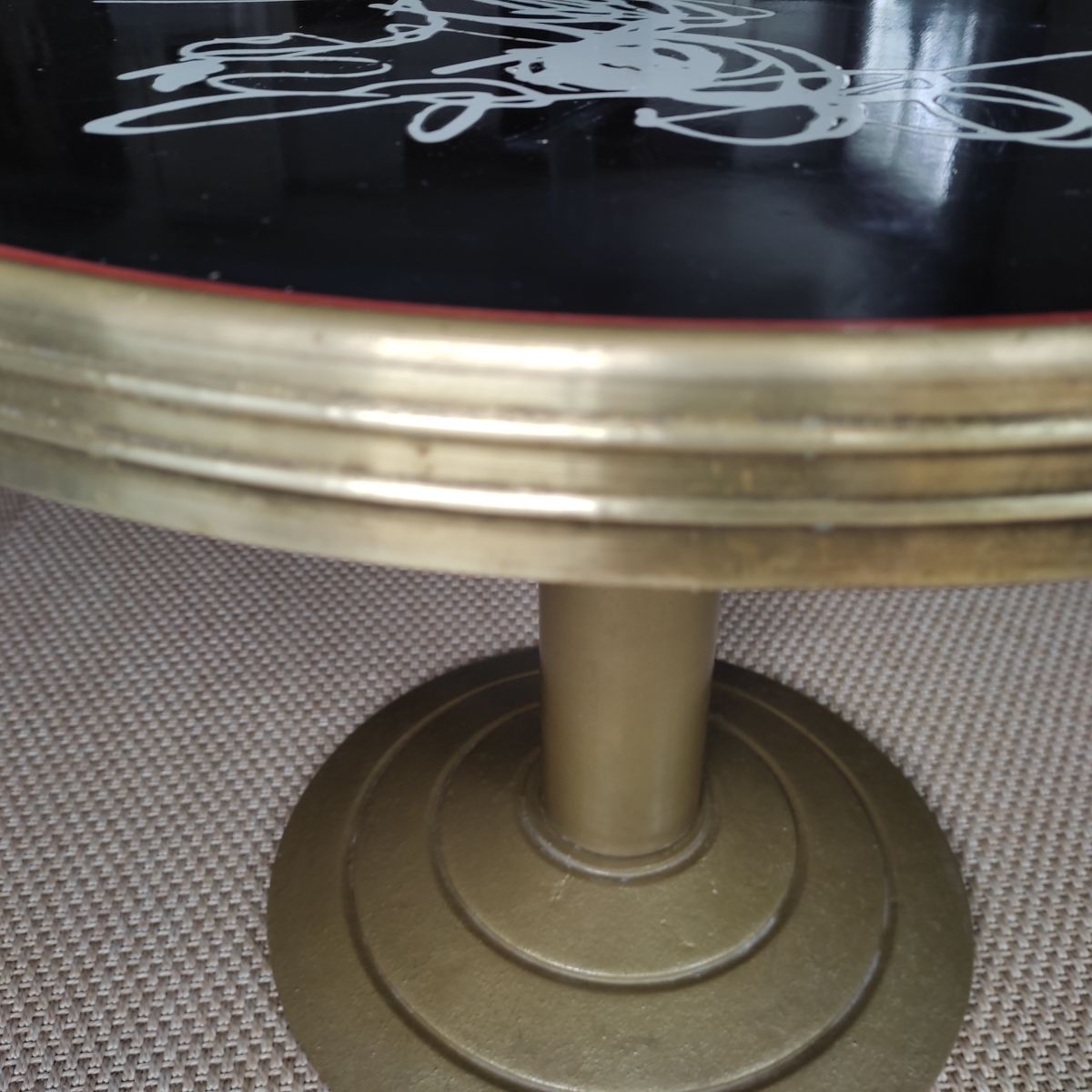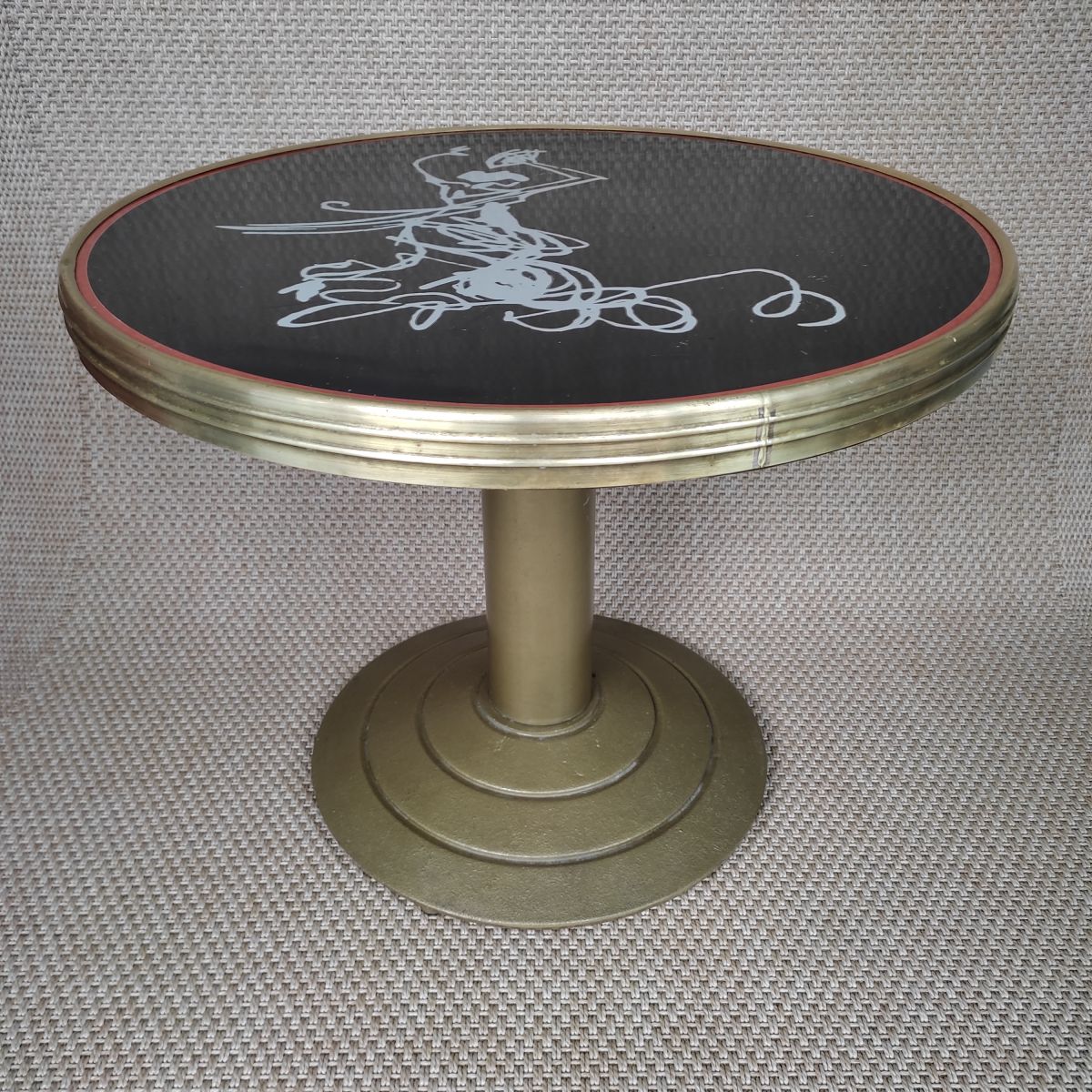 Table basse vintage avec piètement en fonte dorée, le plateau circulaire est en formica et le pourtour a une ceinture de laiton. Le plateau est décoré d'une très jolie danseuse gitane blanche en léger relief sur un fond noir. Légère trace d'utilisation du à son âge mais très bonne solidité et stabilité de l'ensemble. Cette table peut servir aussi bien en intérieur qu'en extérieur au bord d'une piscine ou dans un patio.