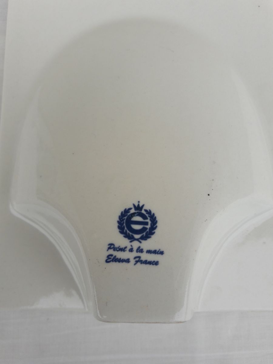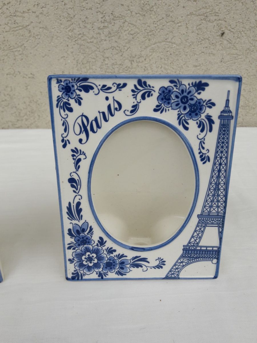 2 cadres porte-photos en porcelaine au décor de Paris, fabriqués en France, marque au dos.