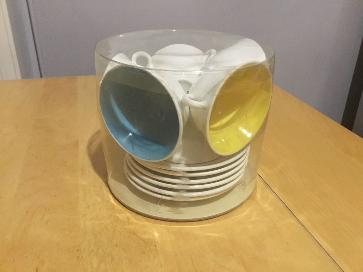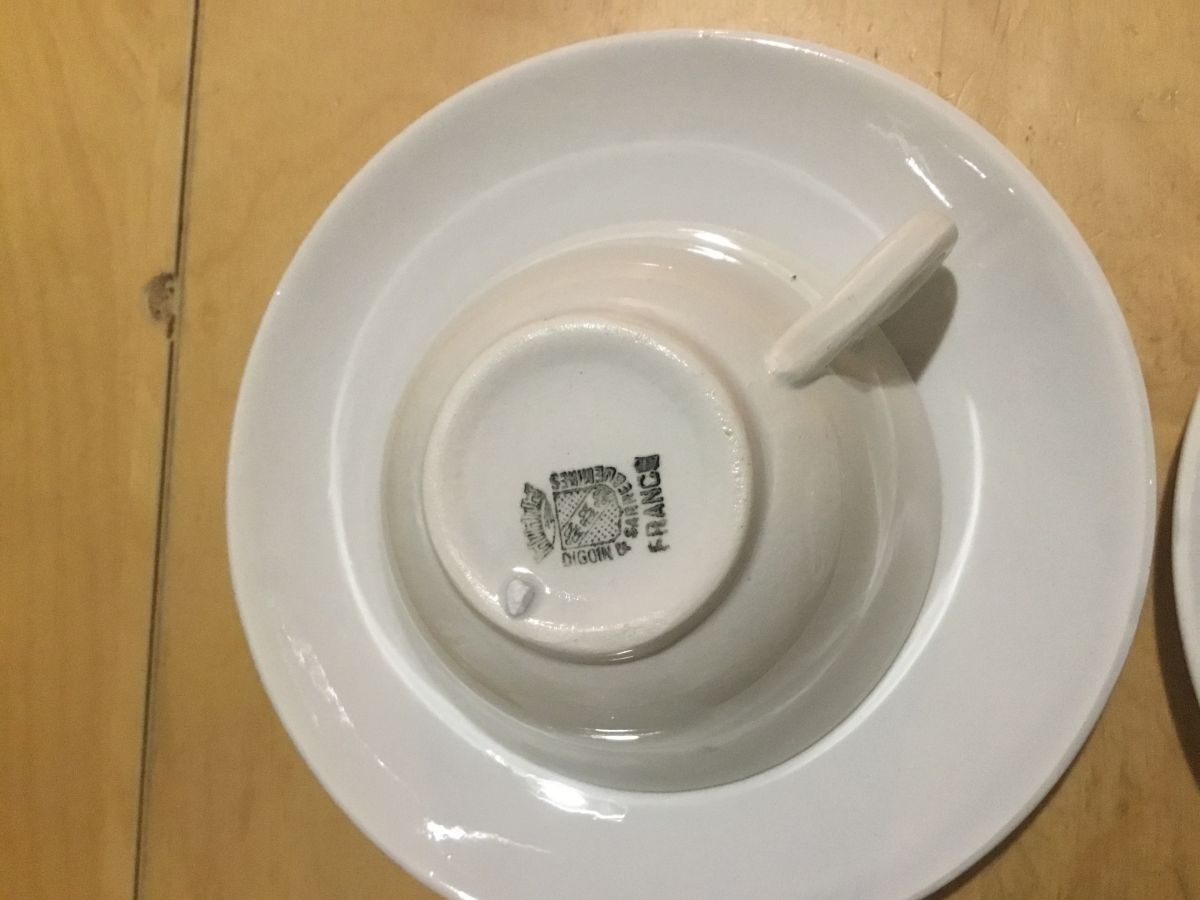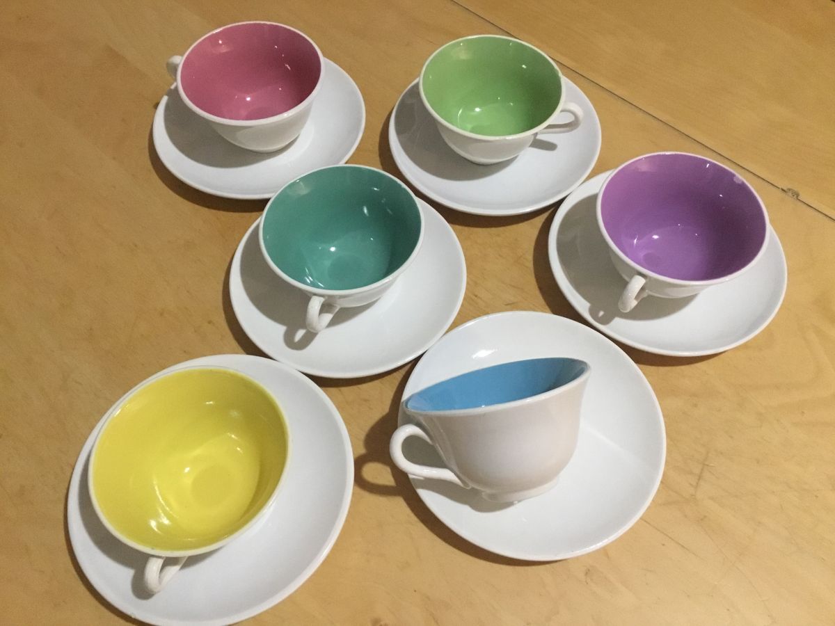 6 tasses à café vintages colorées, avec leurs sous tasses unis blanches en porcelaine de Sarreguemines Digoin. Jamais utilisées et dans leur boîte origine. Un très léger manque sur la tasse mauve( voir photo).